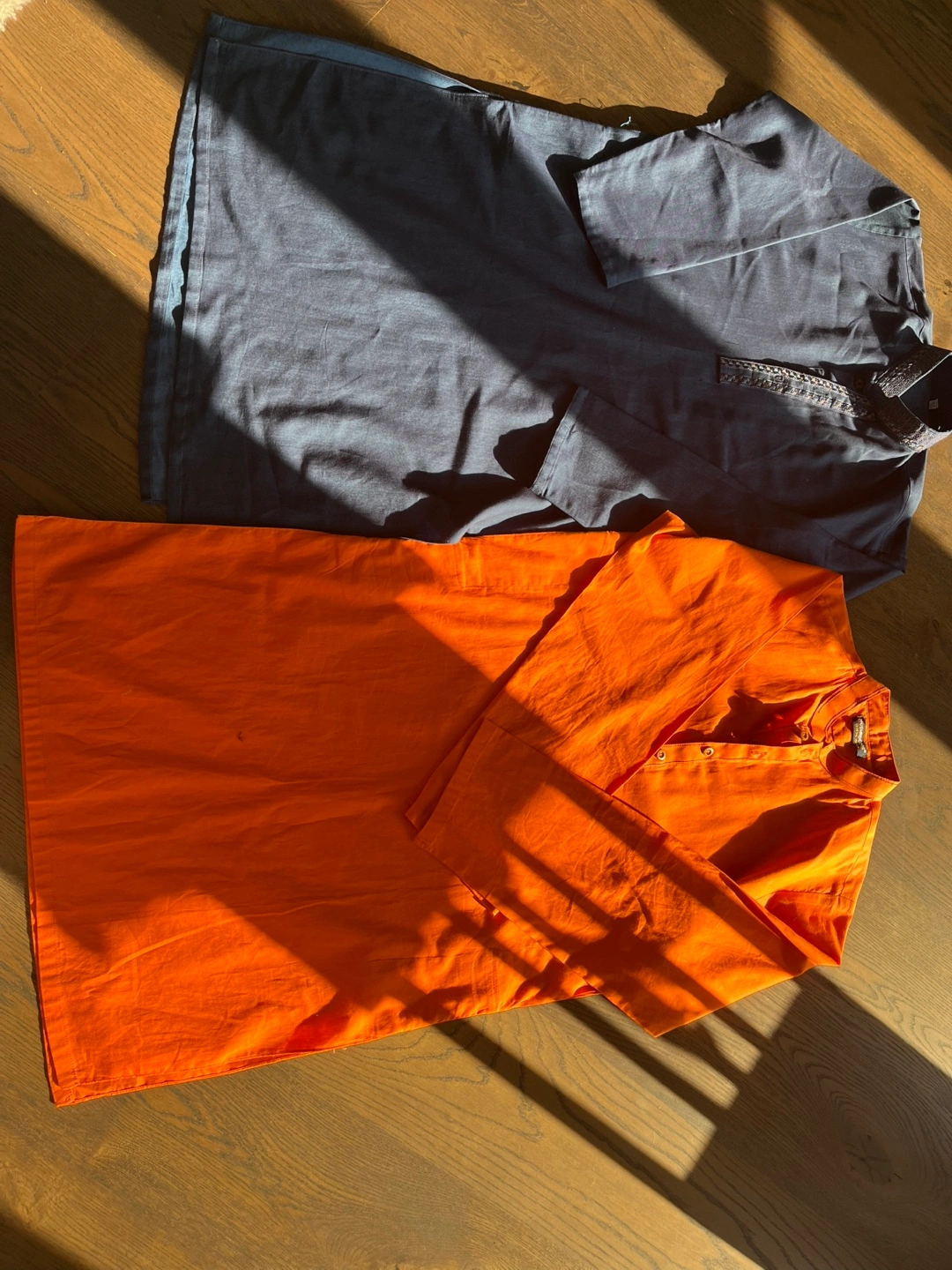 Selling two gently used men's kurta shirts. One is a nice blue colour, and the other is a vibrant orange. Both are in good condition and ready for a new home! 10 to 12 years