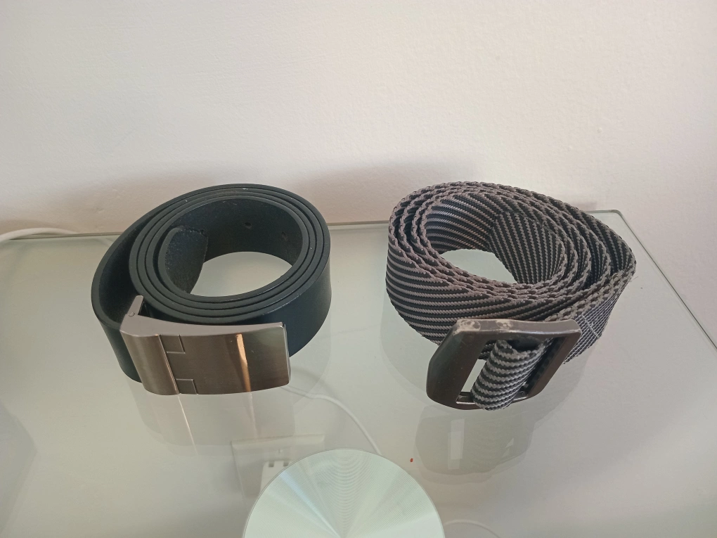 Selling two belts. One is a black leather-like belt with a silver buckle, and the other is a grey woven belt with a dark grey buckle. Both are in good condition and ready for a new home!