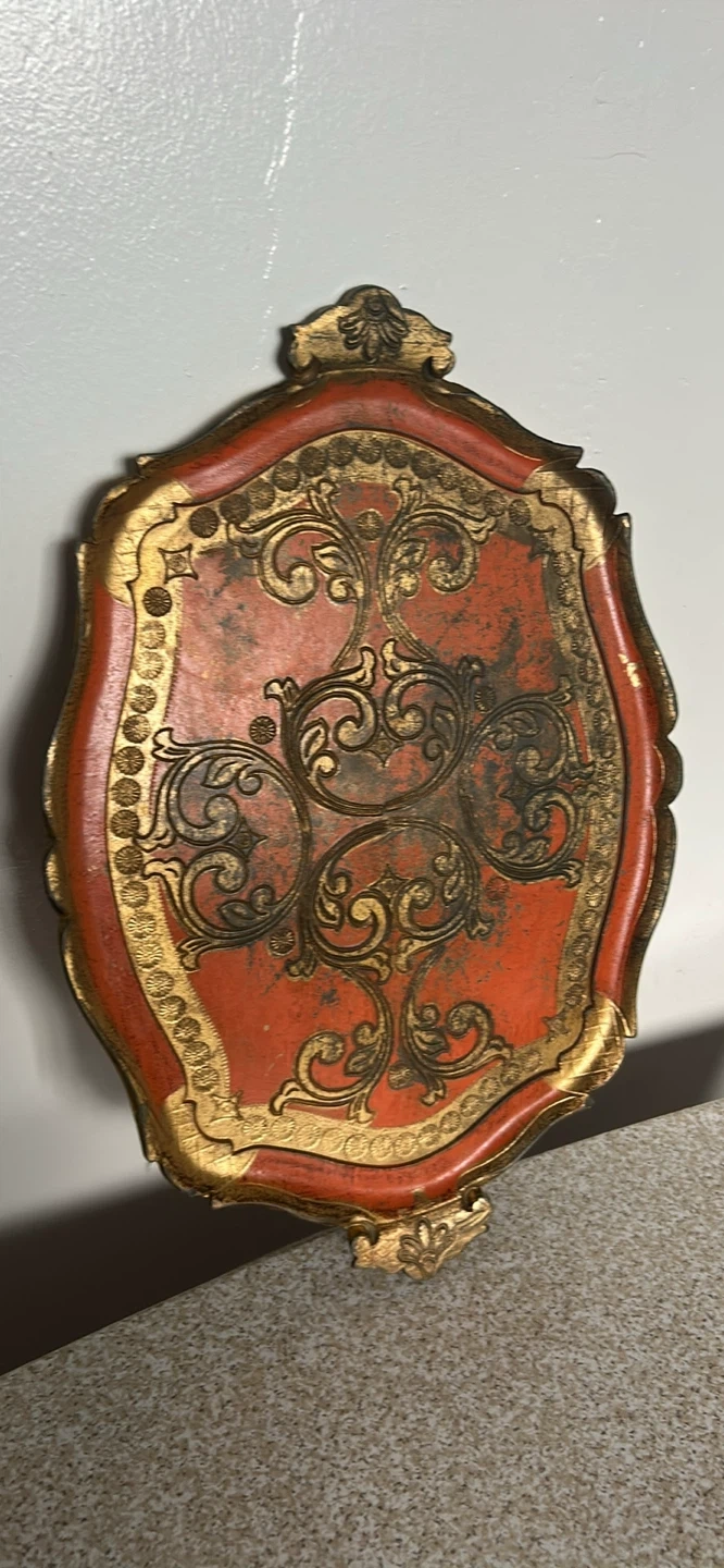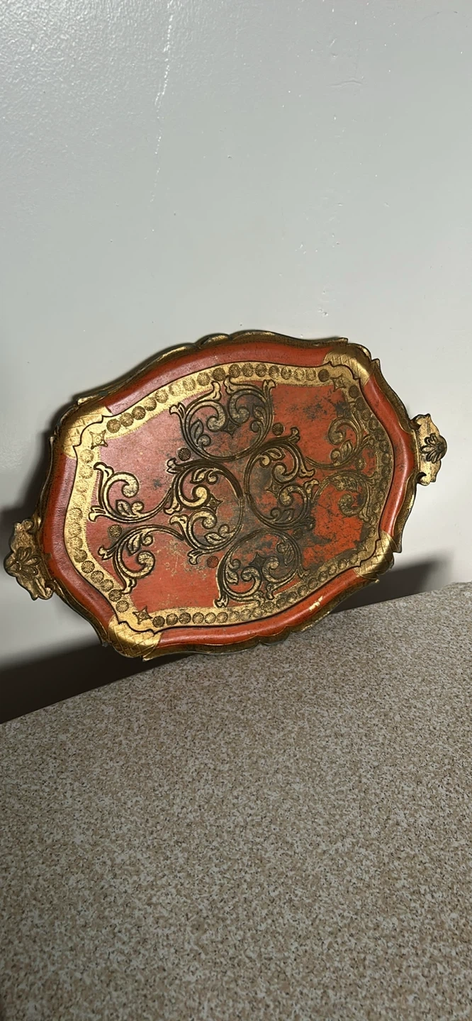Selling a vintage decorative tray, marked 'Made in Italy' on the back. It features a beautiful orange and gold design. Perfect for adding a touch of vintage charm to your home!