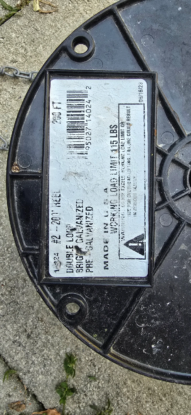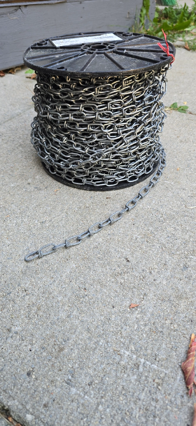 Selling a 200 ft reel of double loop bright galvanized chain. The chain is pre-galvanized and made in the USA. The work load limit is 115 lbs. It looks to be in good condition!