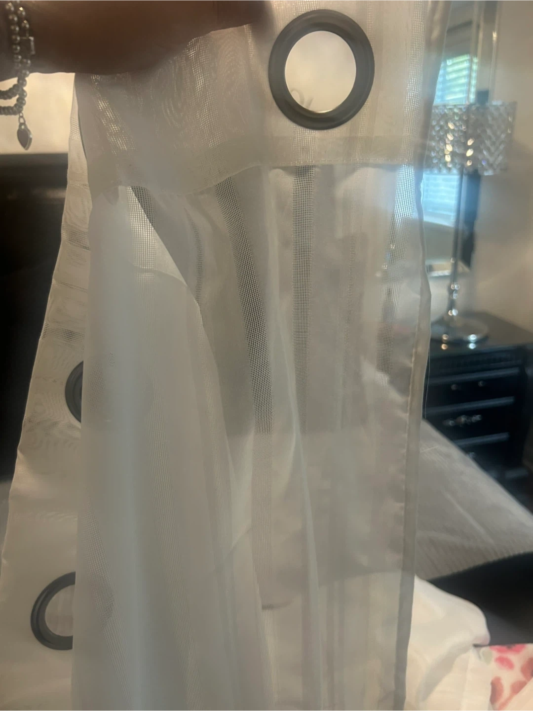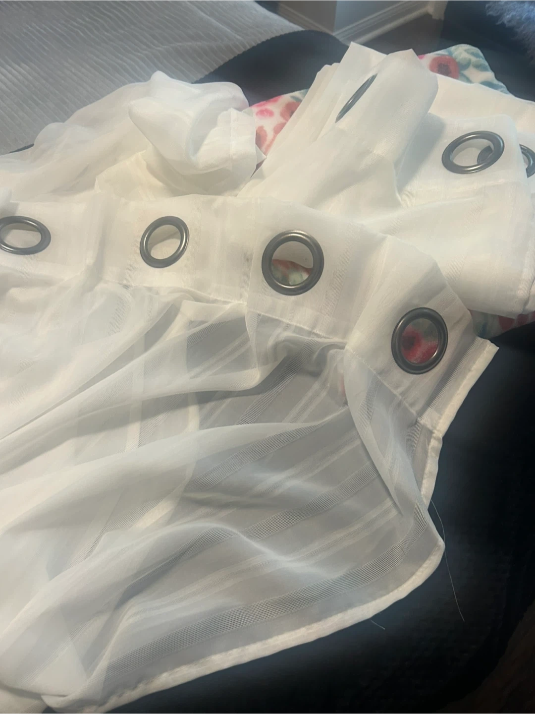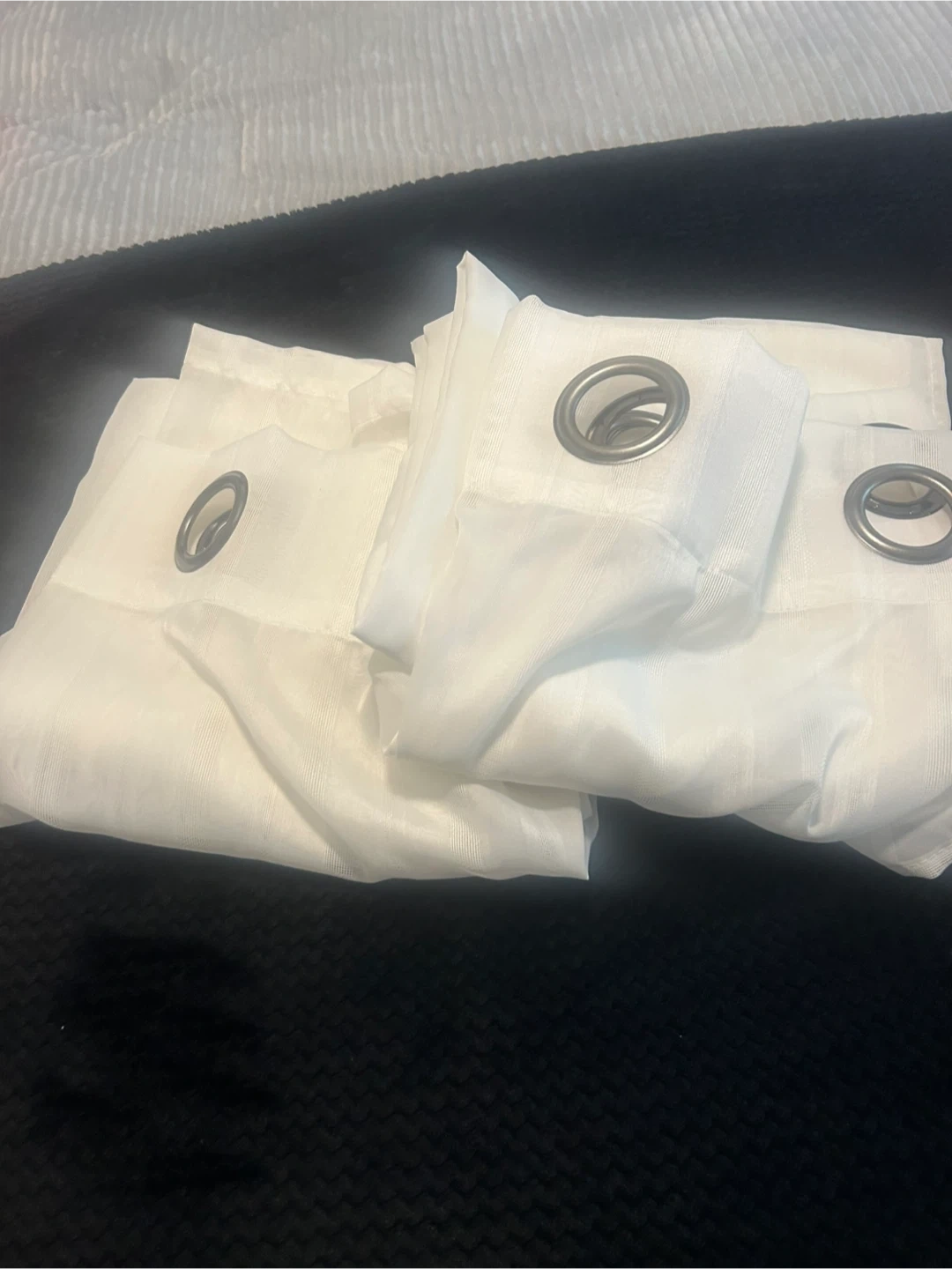 Selling a set of white sheer curtains. They have a subtle striped pattern and metal grommets at the top for easy hanging. Perfect for letting in light while still providing some privacy!