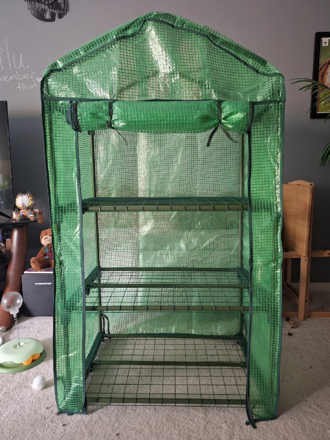 This mini greenhouse is perfect for starting seedlings or protecting plants from the elements! It features: - 3 tier shelves for ample storage space - Roll-up door for easy access and ventilation - Plastic cover that's high transmittance, bird proof, and helps with heat preservation - Measures approximately 49.2" (125cm) tall, 27.2" (69cm) wide, and 18.9" (48cm) deep