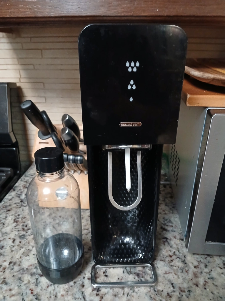 SodaStream sparkling water maker. It's in great condition and ready to use. Comes with 2 bottles that are dishwasher safe (only one pictured). Also will include 2 empty gas canisters you can exchange for new gas. Works perfectly