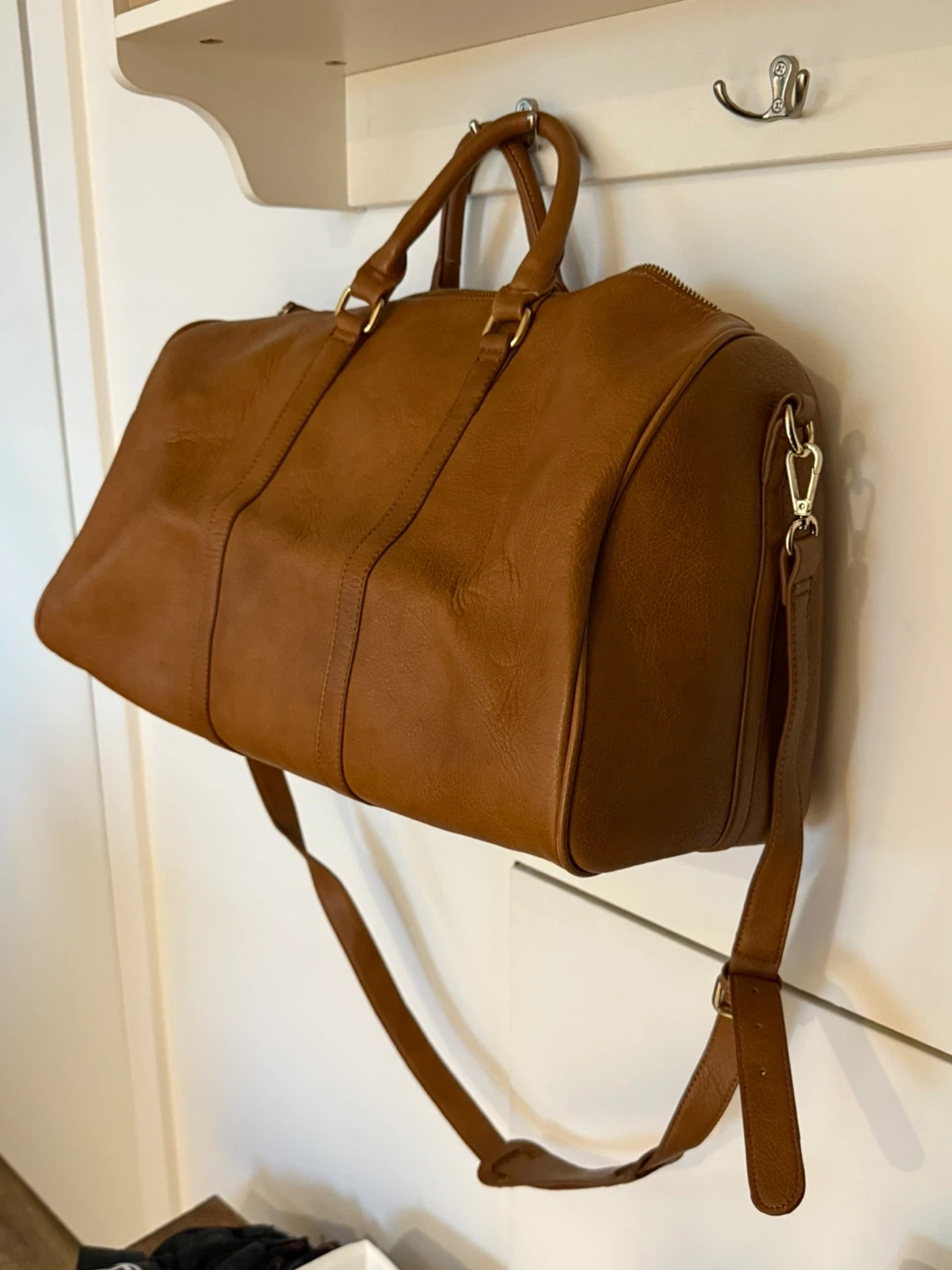Selling a brown faux leather travel duffel bag. It's in great shape and has just been sitting in storage. Perfect for weekend getaways or as a stylish carry-on. 17” x 10” x 9.5” at its base