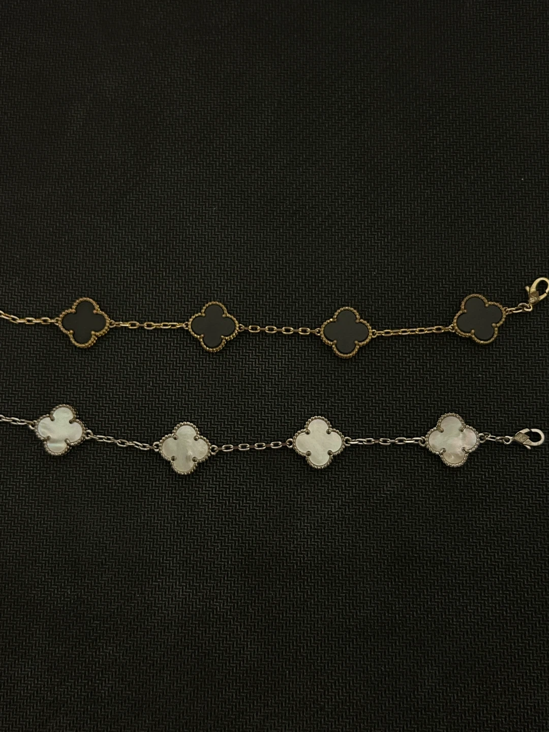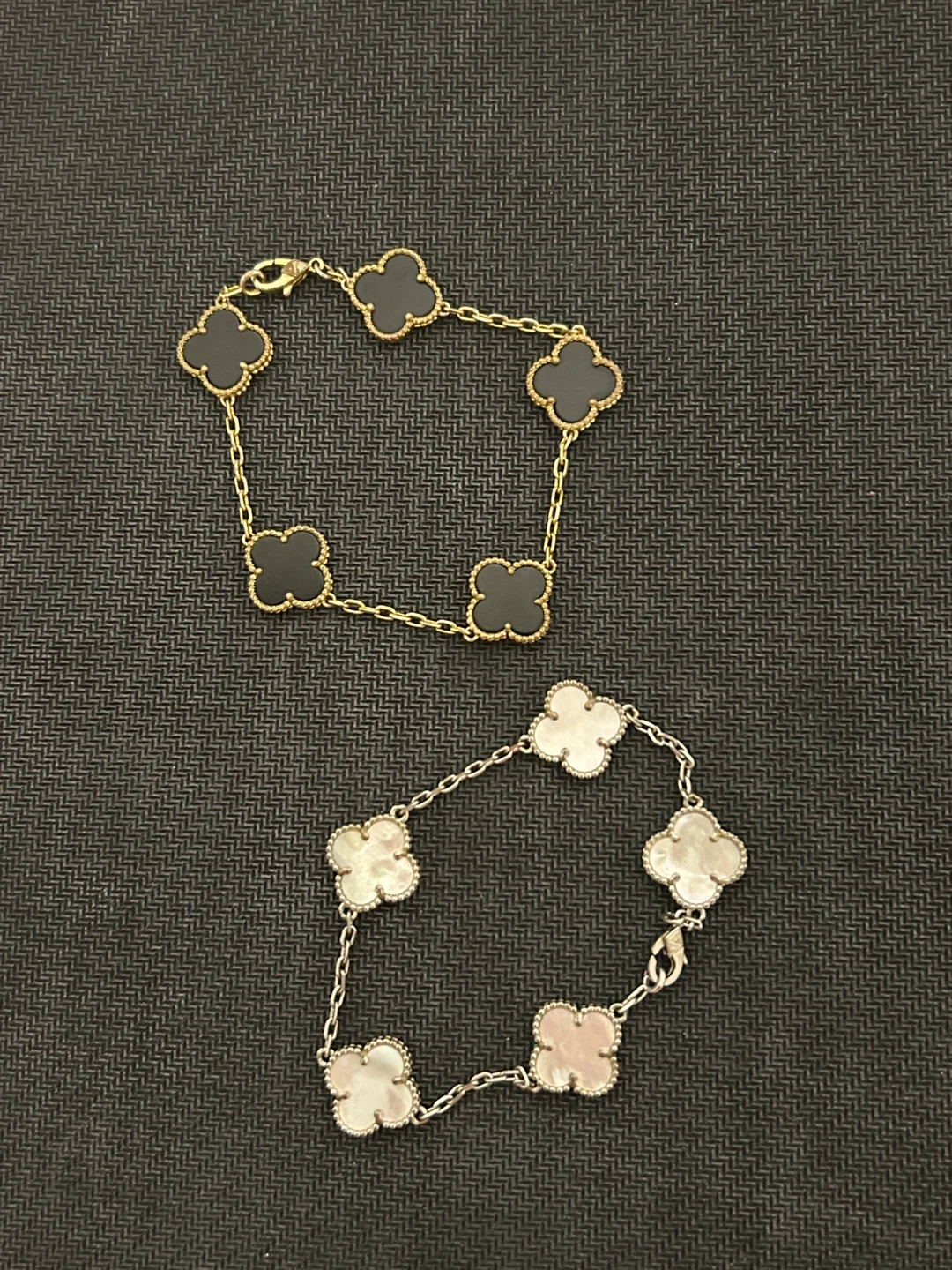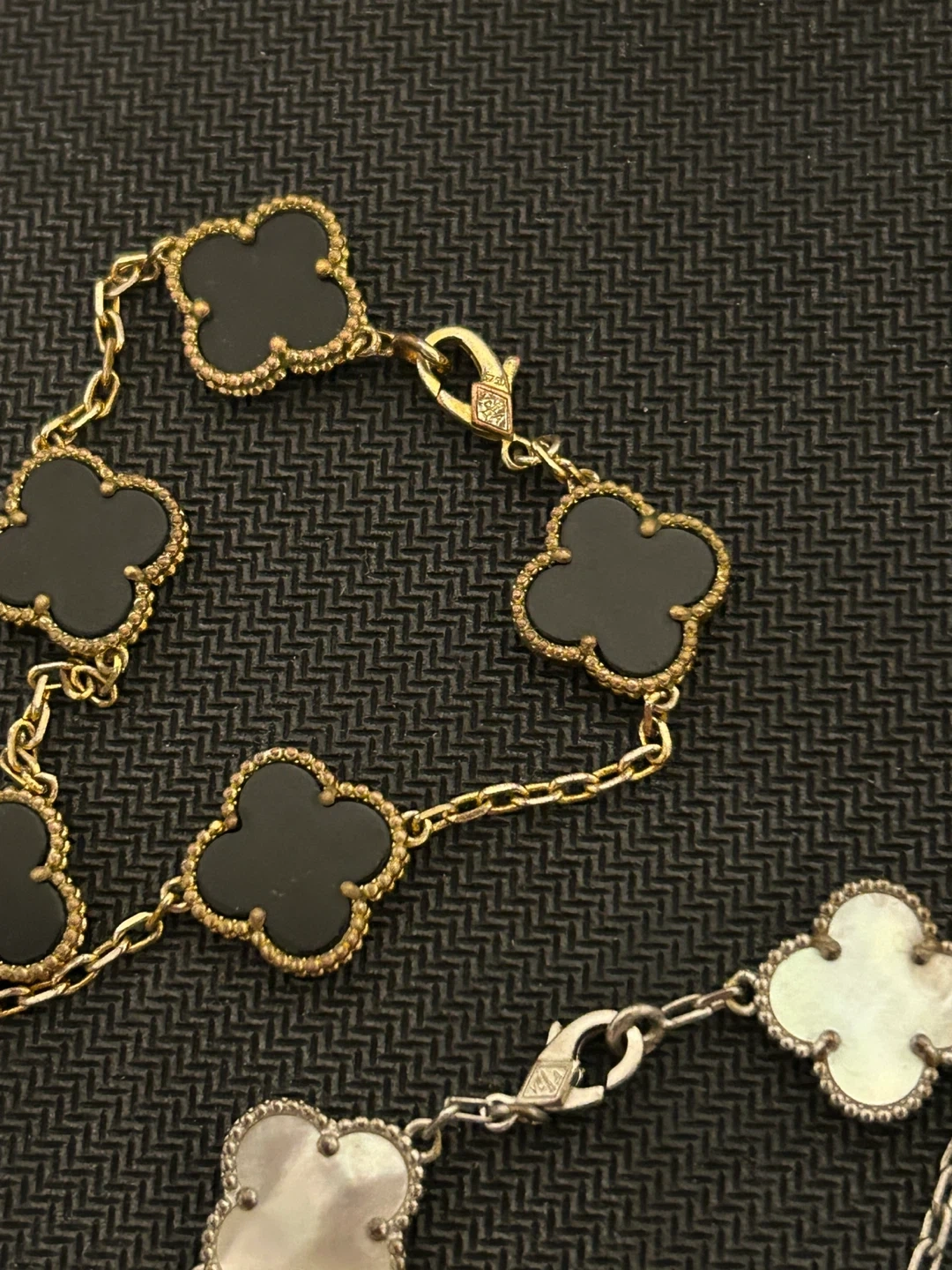 Selling two Van Cleef & Arpels Alhambra bracelets. One is gold with black clover motifs, and the other is silver with white clover motifs. Pre loved. $60 for both or $30 each