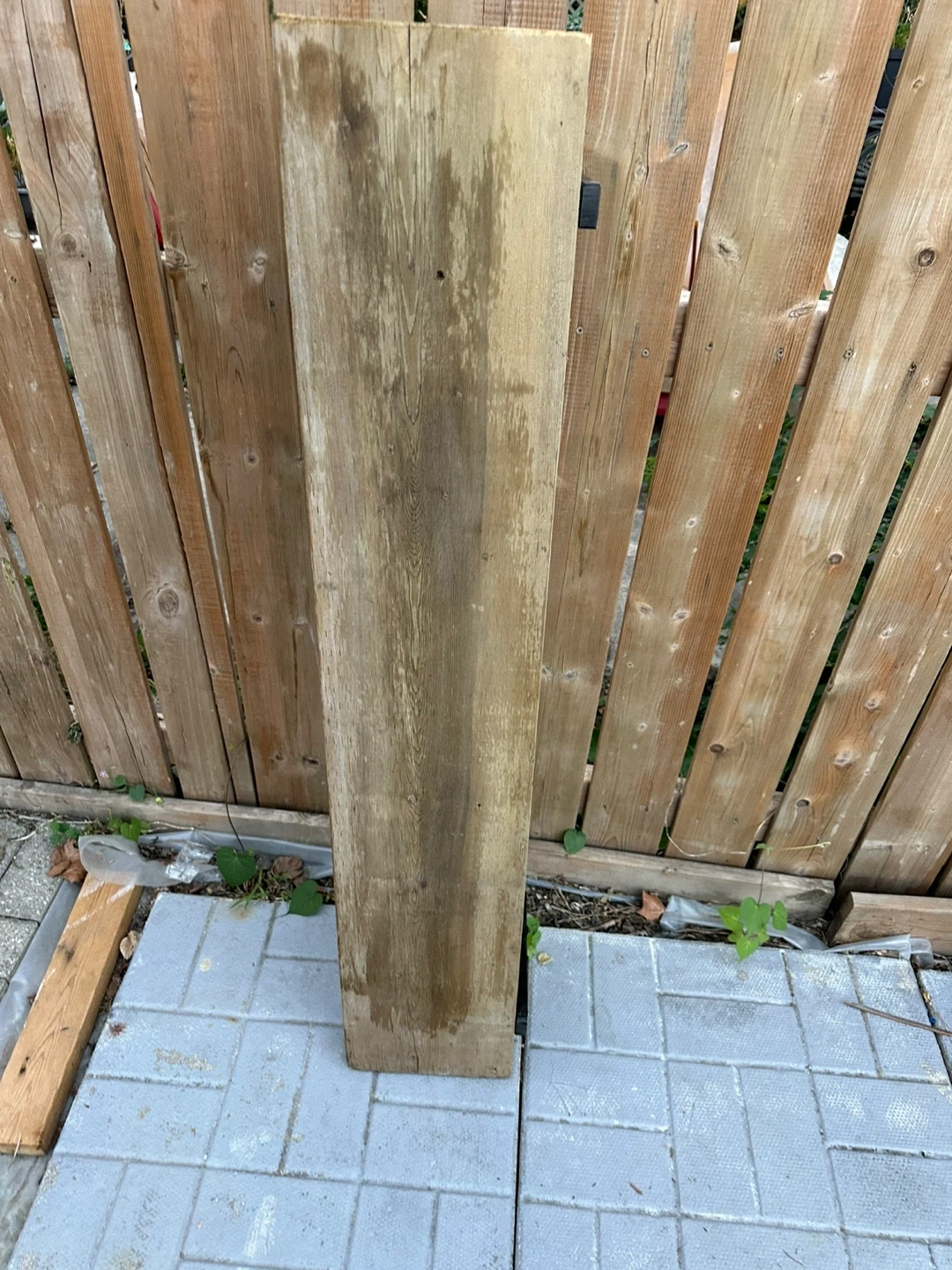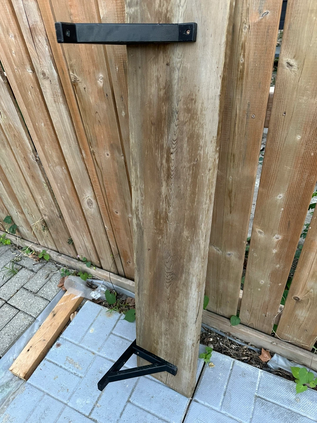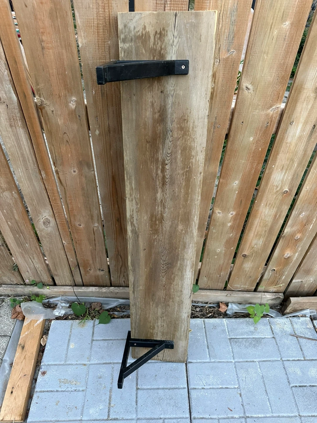 Selling a wooden shelf with black metal brackets. It's in good condition and ready to be installed. Perfect for adding some extra storage space!