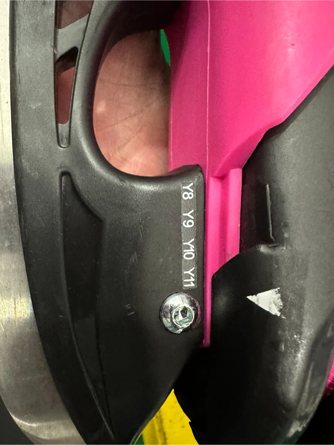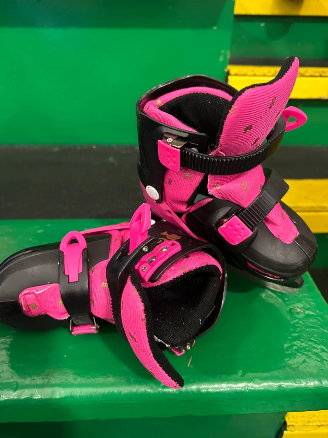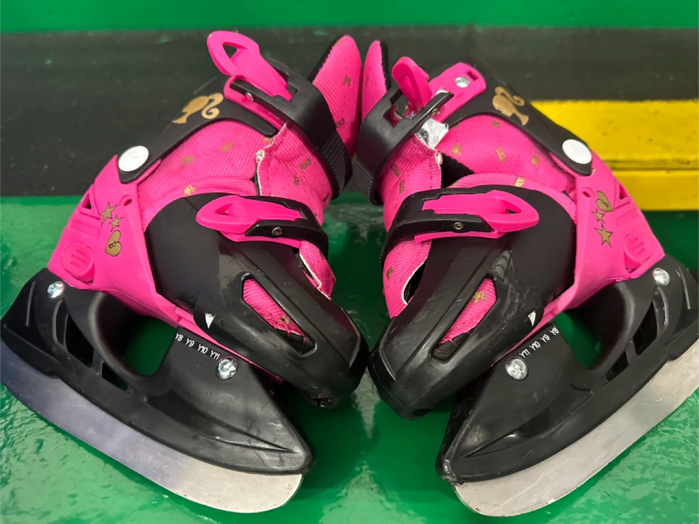 Selling a pair of pink and black ice skates, perfect for kids! They're in good condition and ready for some fun on the ice. The size is Y8.