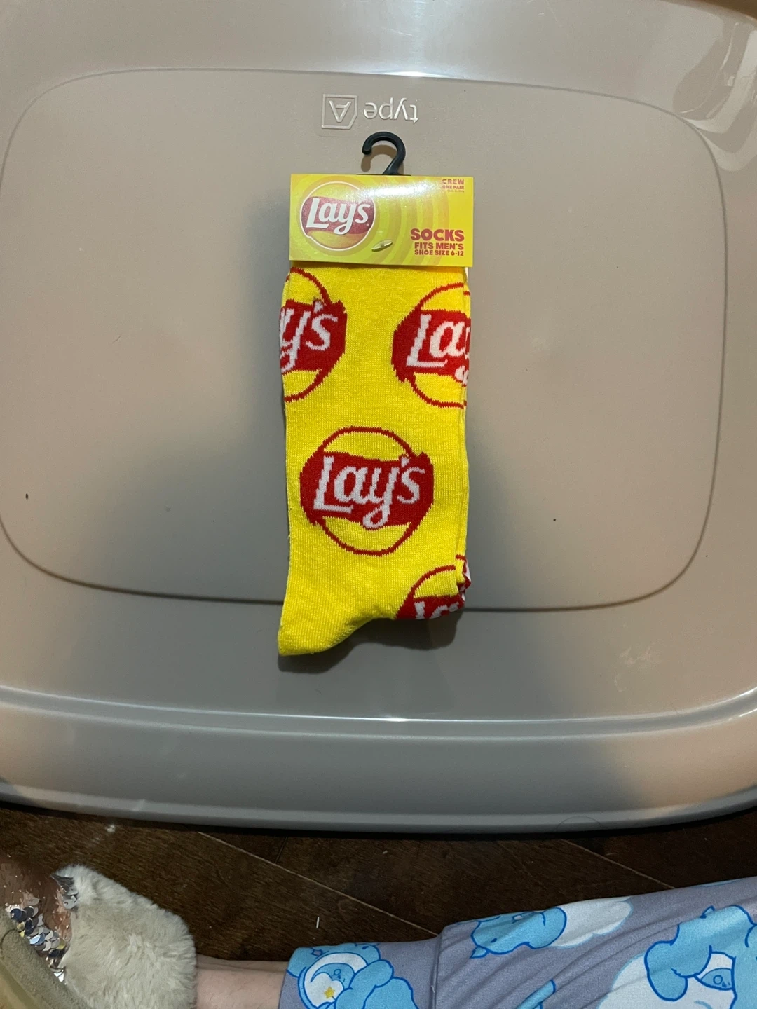 Selling a pair of Lay's crew socks. They fit men's shoe size 6-12. These socks are bright yellow with the Lay's logo all over them!