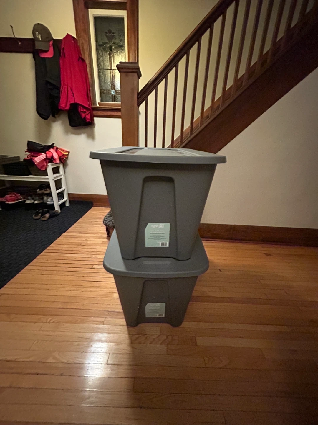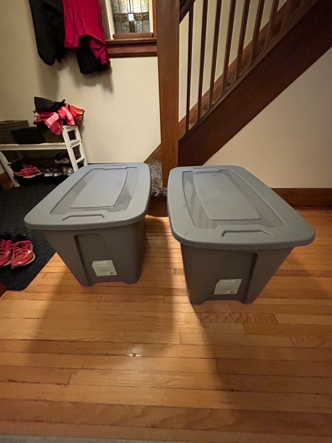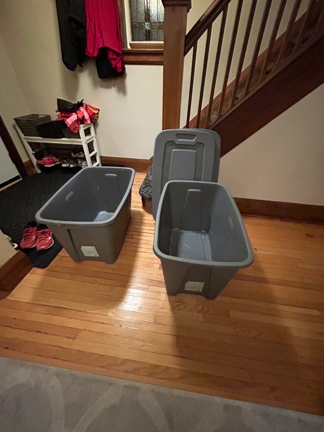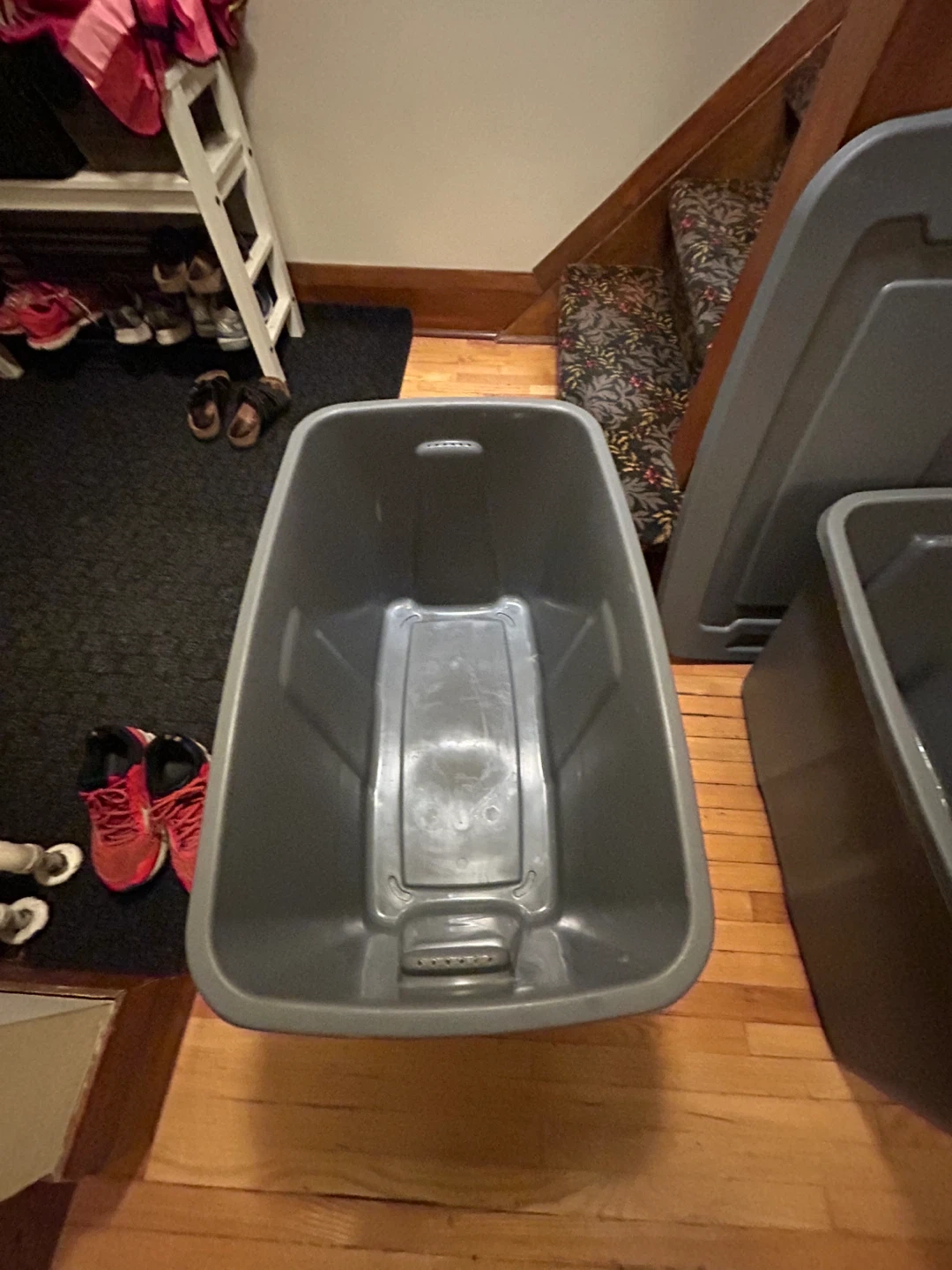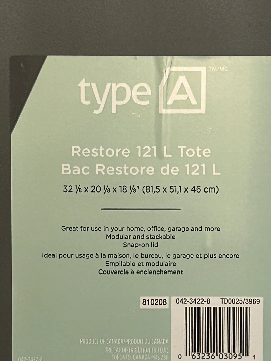 type A Restore Stackable Nesting Storage bin Box with Lid, 121-L, Grey 7.00 each 12.00 for the pair of them Dimensions: 32-1/8 x 20-1/8 x 18-1/8” (81.5 x 51.1 x 46 cm) Flexible re pickup Elmsdale Road M4J 3M3 Donlands O'Connor East York Don Mills south exit off DVP A must-have storage solution, this type A Restore Nesting Tote has a stackable design that takes up less space and helps keep your home tidy. Featuring a generous amount of interior space, this tote container can be used to store, organize, and protect heavy equipment, papers, clothing, valuables, and more. A handy lid shuts tight while the heavy-duty design makes this bin the ideal choice for use as a basement or garage storage tote Has a modular and stackable design that helps you keep items neatly stored and organized while taking up less space Snap-on lid for easy closure Great for use in your home, office, garage and more Ideal for storing clothing, blankets, toys and more around your home