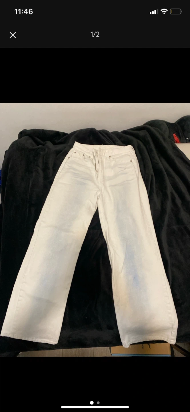 Selling a pair of AGOLDE white denim jeans. They're in great condition and ready for a new home! These jeans are perfect for a casual, stylish look. They are a light wash denim, perfect for spring or summer!