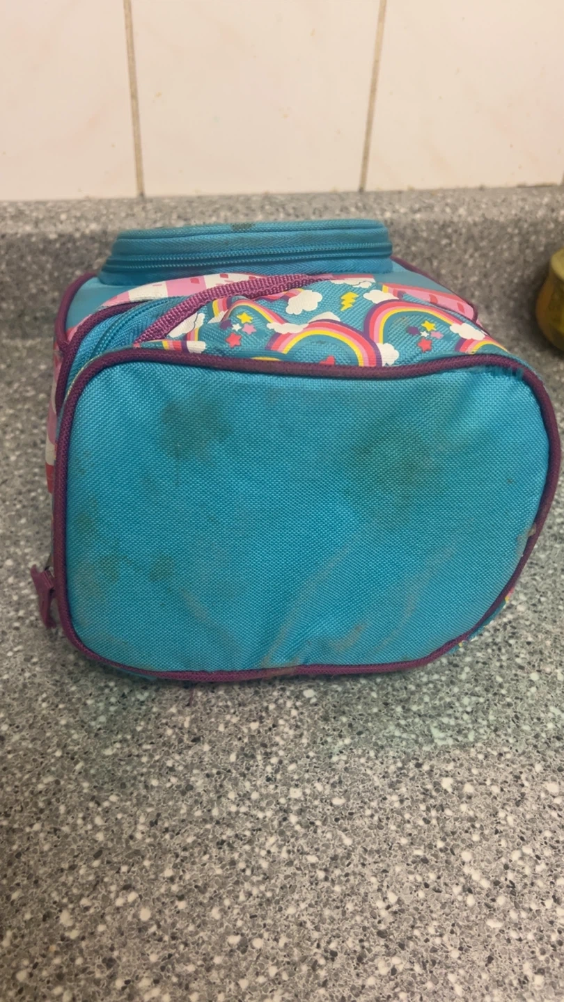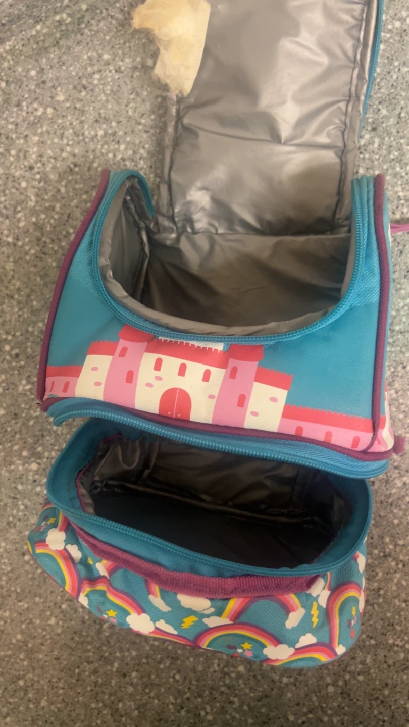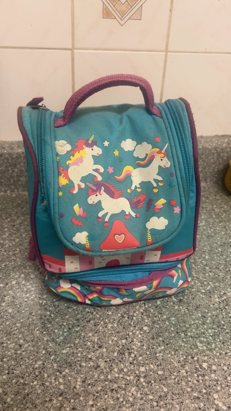 A cute lunch bag featuring unicorns and a castle design! It has a top handle and a zippered closure. Perfect for keeping your little one's lunch cool and organized