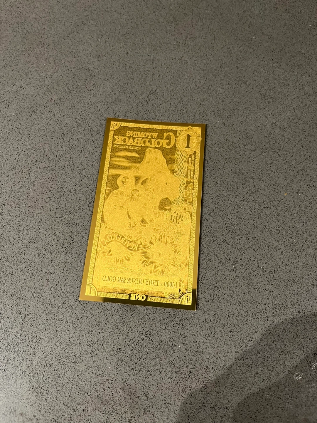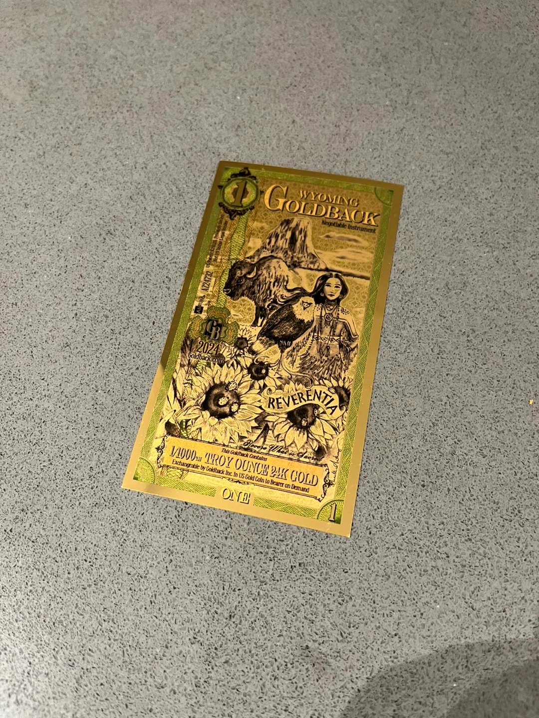 Selling a Wyoming Goldback Reverentia. It features a detailed design and is made with 1/1000th of a troy ounce of 24K gold