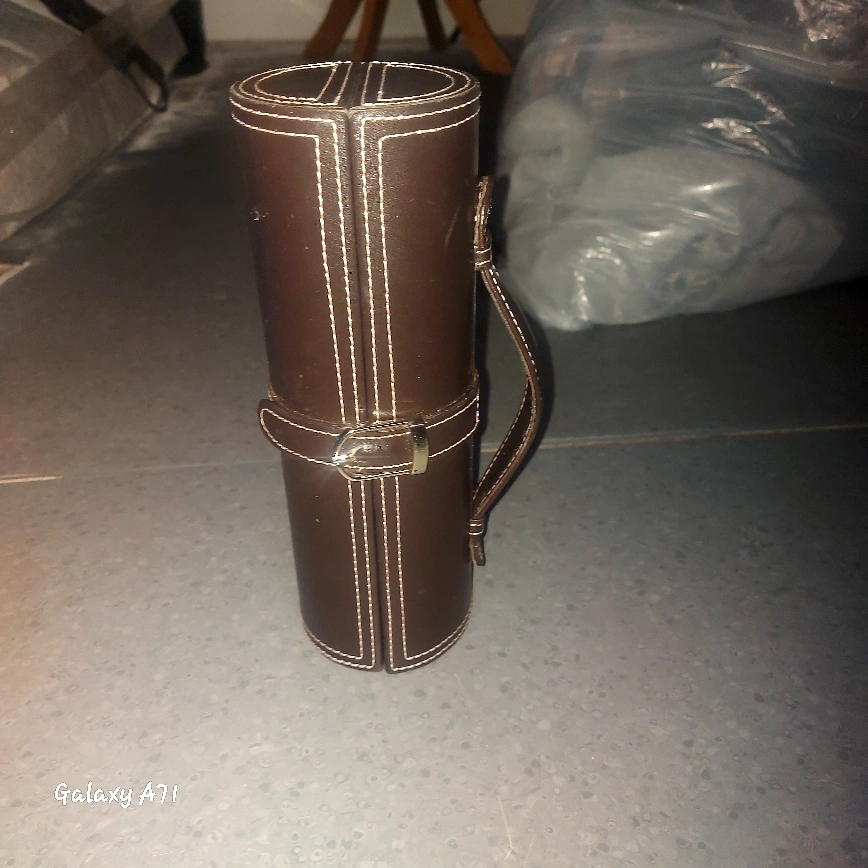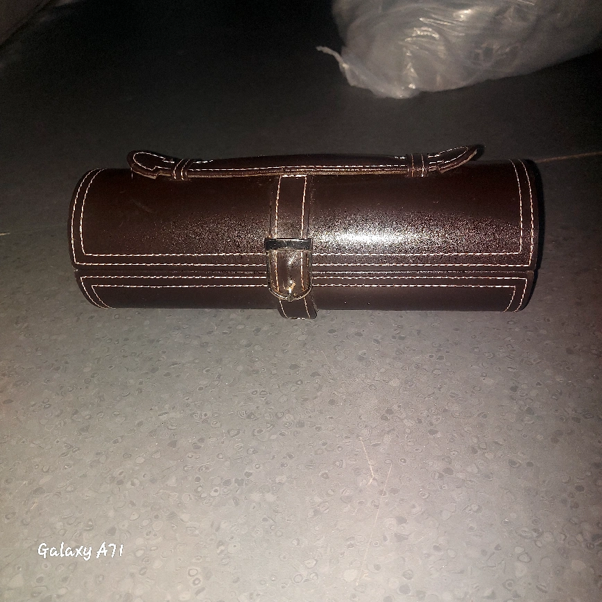 *Tuscan Design chocolate brown coloured, Leather Roll Type Travel Jewelry Box-With Handle. *Still in brand new condition. *Plenty of space for all jewelery-rings, bracelets etc etc *TWO small button straps Inside to secure certain items also.