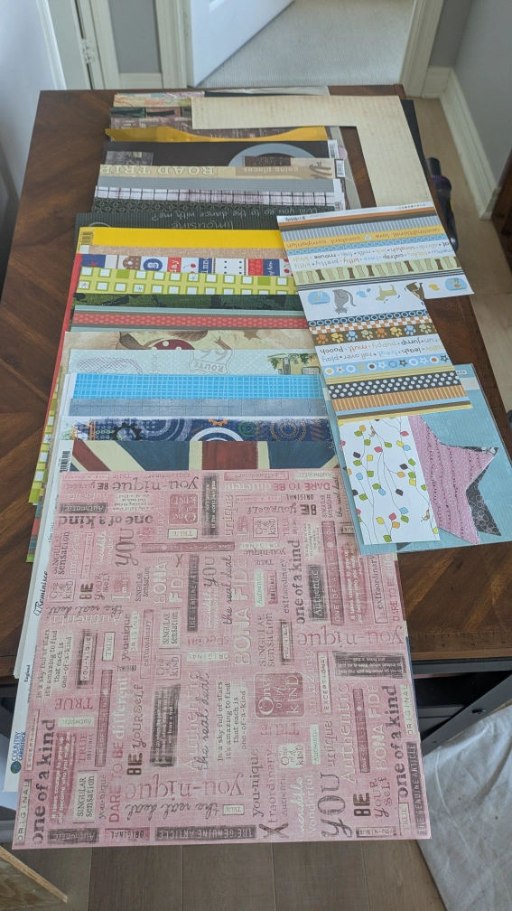 Variety of scrapbooking pages 25+ full sheets, some double sided (so there are more than 25 types of pages) with different colours, patterns, subjects on each page. additional pages that have been used also included but can still be used Locations: Quick easy pick up by Scarborough Town Centre most days Pick up around Union station days I'm at the office for smaller items I can bring with me on the train