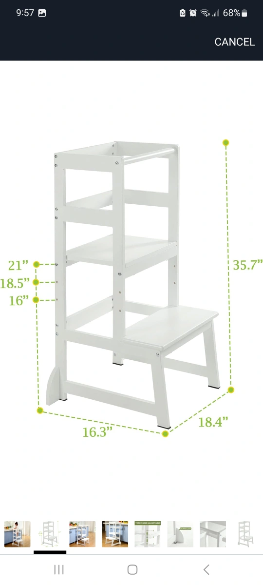 This adjustable height kitchen step stool is perfect for little helpers! It features a safety rail and is designed as a learning tower for toddlers. The stool is white and comes in its original box with all the components and instructions. It's in great condition and ready for a new home!
