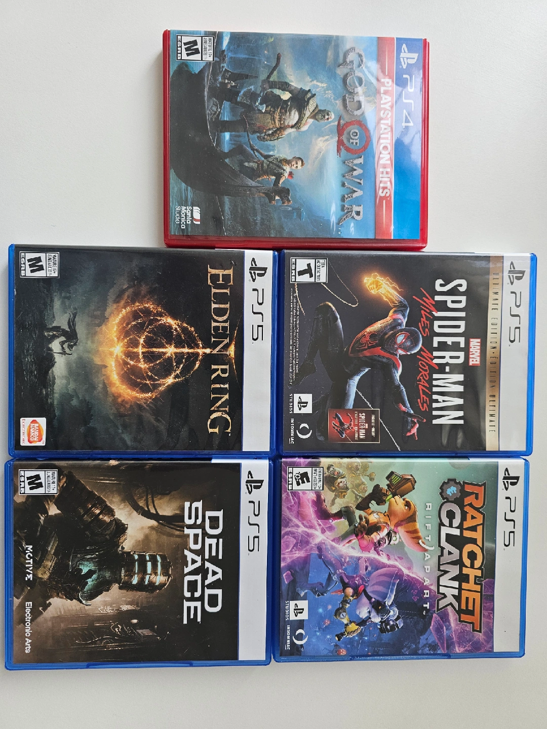 Selling an Original PlayStation 5 Disc Edition in good condition + 2 controllers + games Works perfectly with no issues. Included in the bundle: ✔ PS5 Disc Edition Console ✔ 2 DualSense Controllers (white and blue) ✔ HDMI Cable & Power Cable Games include God of War, Elden Ring, Spider-Man Miles Morales, Dead Space, and Ratchet & Clank Rift Apart ✅ Ready to play right away ✅ Everything tested and working great 📍 Located in Mississauga – quick pickup available 💵 Cash or e-transfer accepted