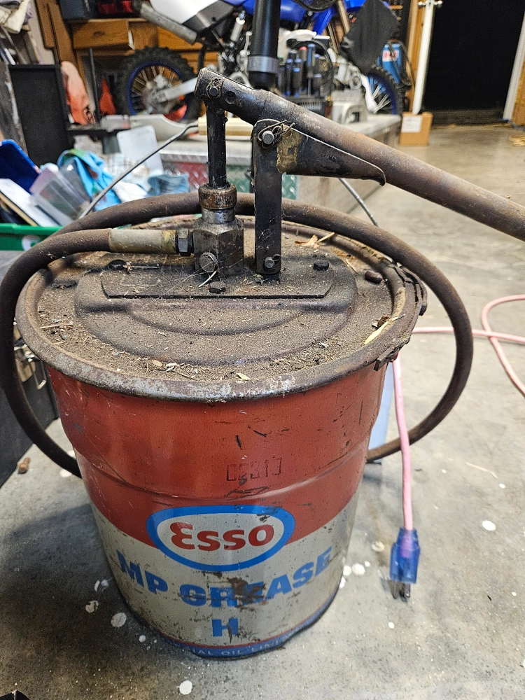 25Selling a vintage Esso MP Grease bucket with a pump. It is still full and functional Perfect for collectors or those looking for a retro piece for their garage or workshop!