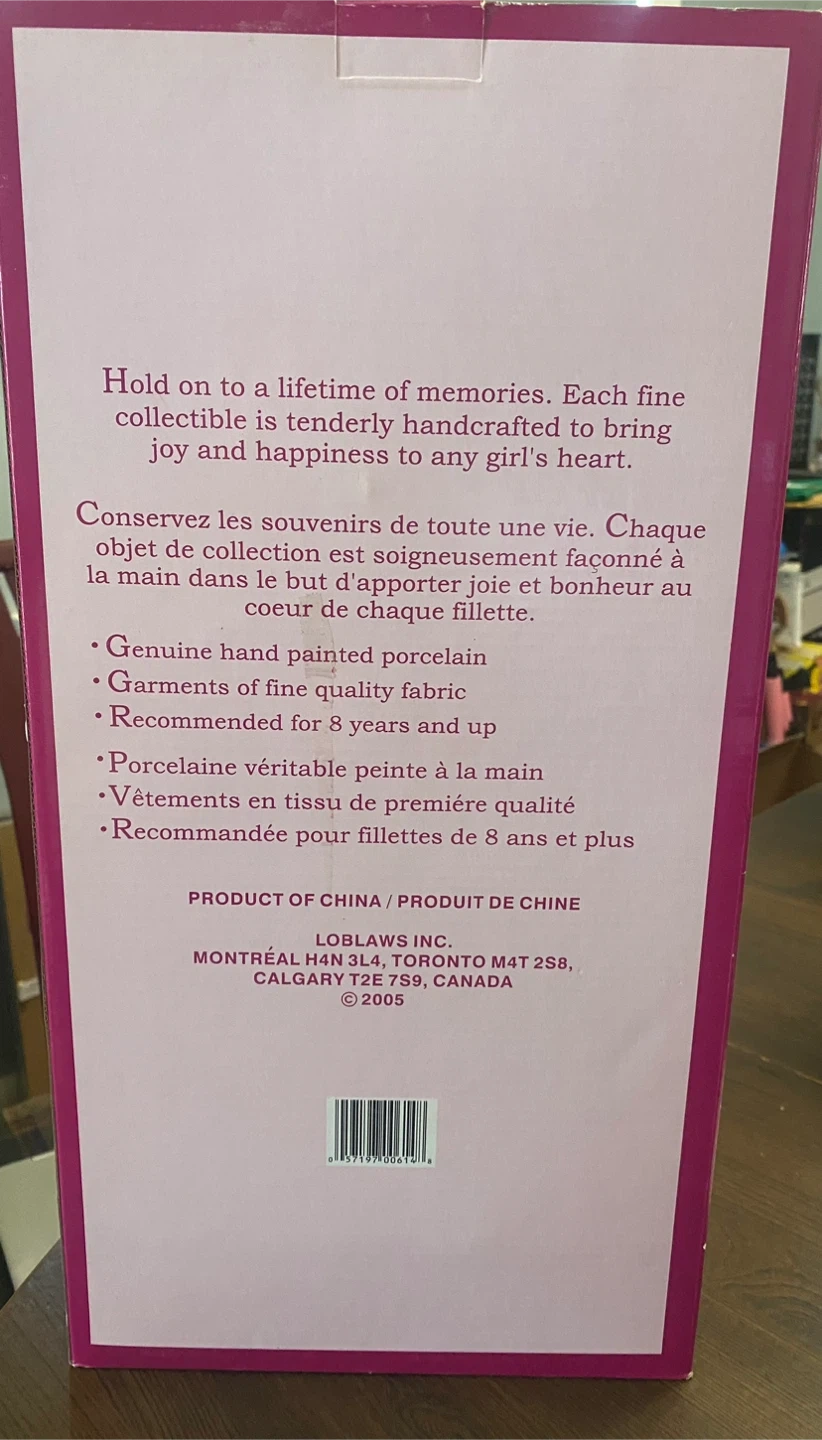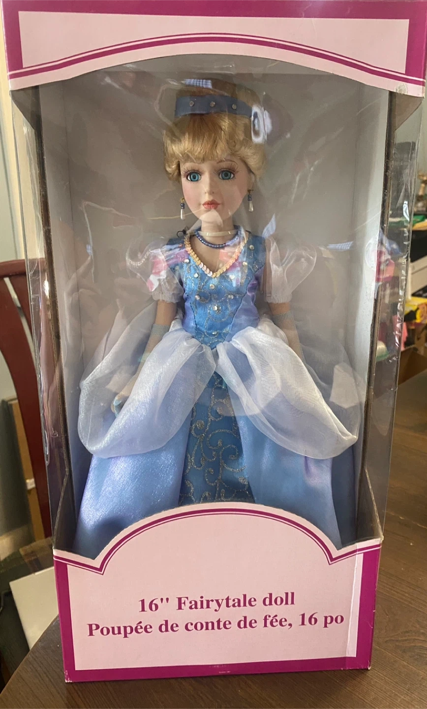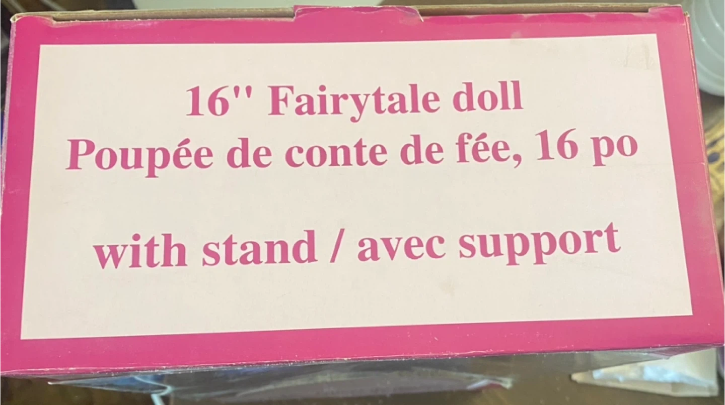 Selling a 16-inch Fairytale doll with a stand. It's recommended for ages 8 and up. This collectible doll is crafted to bring joy and happiness. It's made with genuine hand-painted porcelain and garments of fine quality fabric
