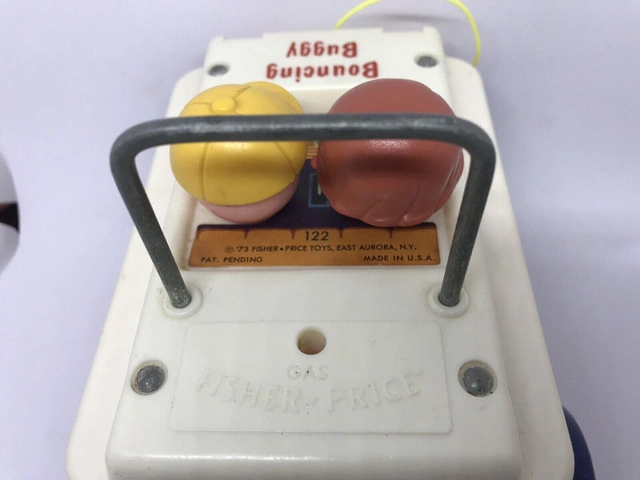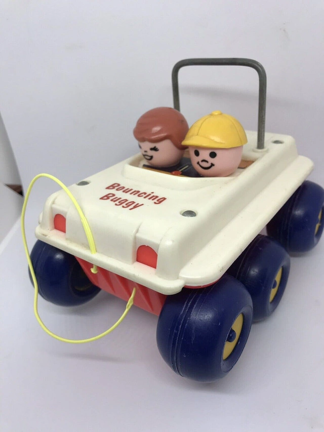 Great vintage toy to add to your collection. Made from 1974-1979 (says copyright 73 on the sticker). This is an all plastic 6-wheel dune buggy that merrily wobbles along when pulled as 2 passenger heads wobble. The buggy makes a realistic "putt-putt" motor sound, rolls on 6 balloon-type wheels, and has a metal roll bar. FPT1651 - RED base, white top plastic dune buggy vehicle that rolls on 6 large blue balloon-type wheels with yellow centers. The buggy has 2 attached plastic passenger heads that wobble, one female with brown hair and one male with a yellow cap. The buggy makes a realistic "putt-putt" motor sound and has a metal roll bar behind the passengers. Measures 5" wide, 6-5/8" long, 5-1/2" high (including the roll bar) Also check out my Pull-a-tune listing