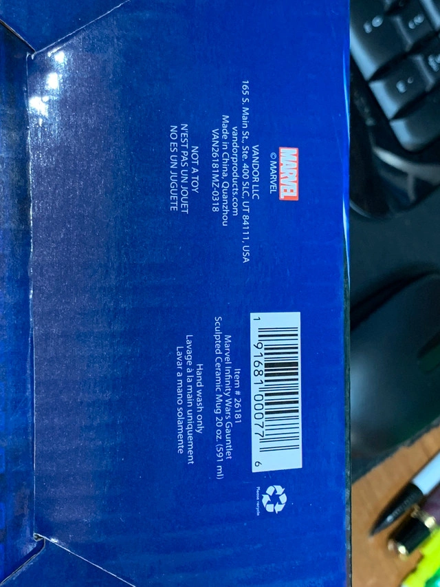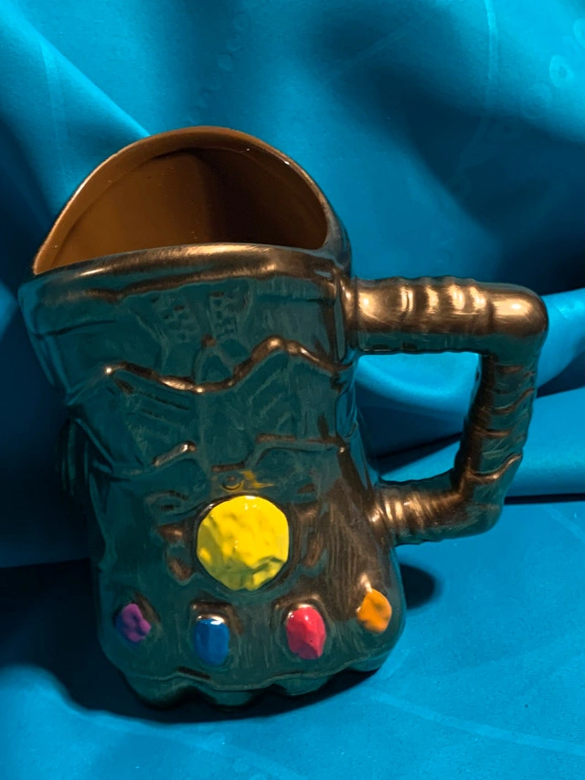 This Infinity Gauntlet mug will make your coffee a snap Holds 20oz. 591 ml New in box Thanos was right Willing to trade for Spider-Man comics More Info: Pop Culture Collectibles