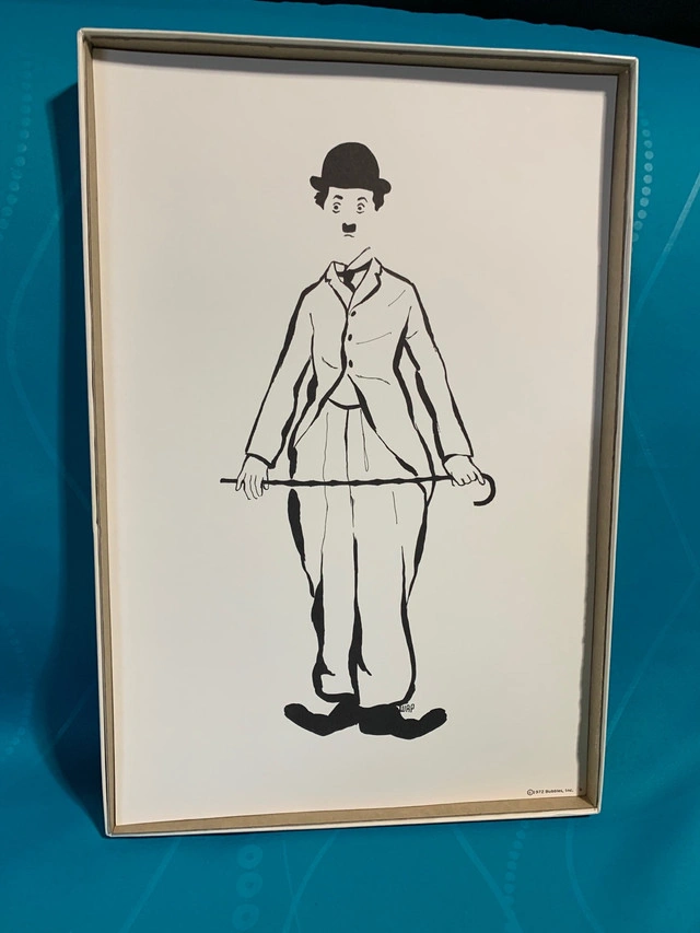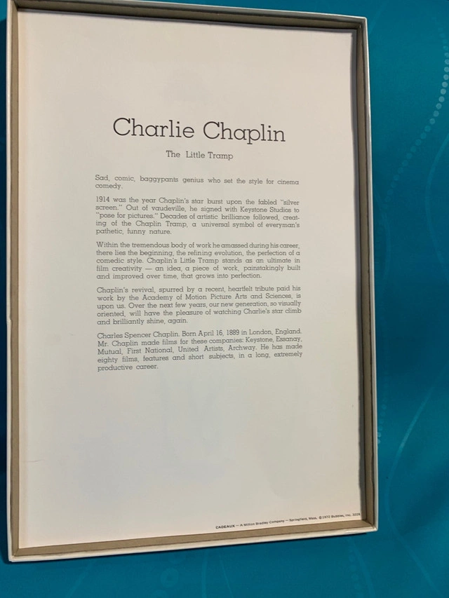 Beautiful set of Charlie Chaplin prints made by Cadeaux which is a Milton Bradley Company C 1972 item number 3228. Only contains 4 of the 6 prints plus the cover sheet. Prints are 10 x 15" and would be nice to frame up. Box cover has some damage.