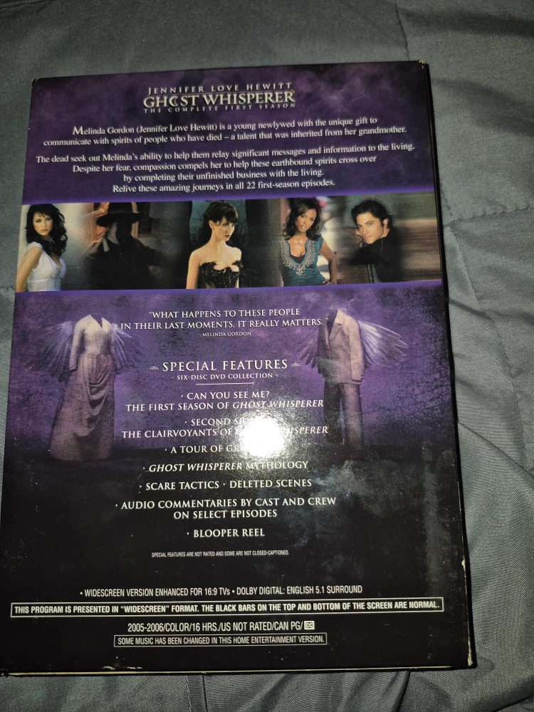 Selling the complete first season of Ghost Whisperer on DVD! This six-disc set includes all 22 episodes from the first season. Enjoy the special features like deleted scenes, blooper reel, and audio commentary by the cast and crew