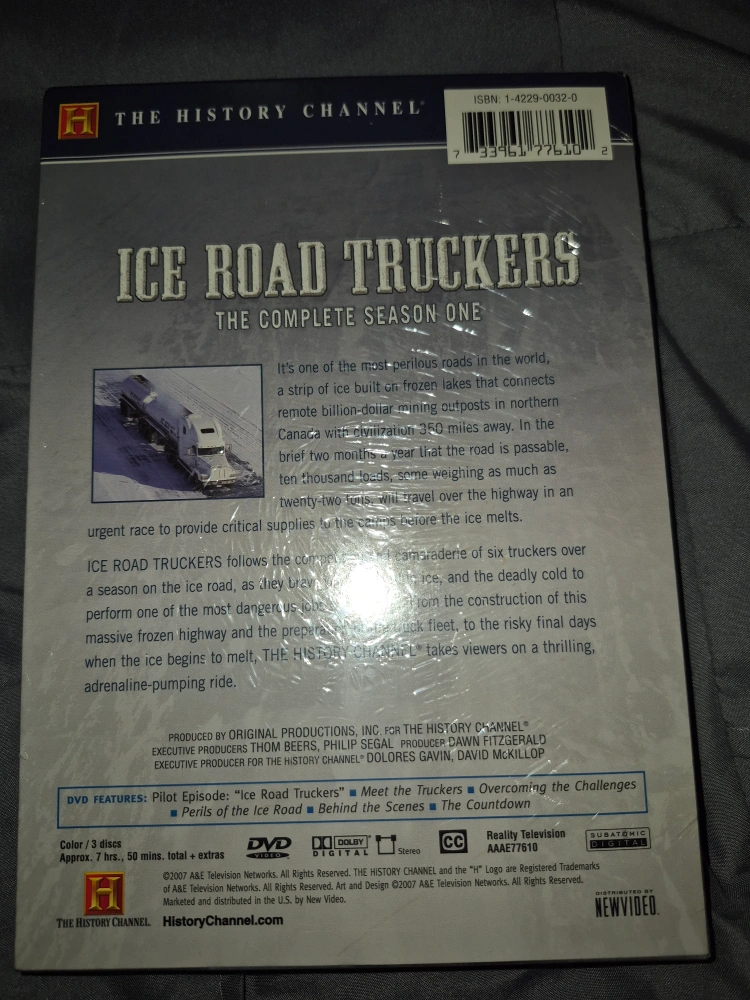 Selling a sealed copy of Ice Road Truckers: The Complete Season One on DVD! This set includes 3 discs with approximately 7 hours and 50 minutes of content. Dive into the adrenaline-pumping action on some of the most dangerous roads in the world! DVD features include the pilot episode, 'Ice Road Truckers', 'Meet the Truckers', 'Overcoming the Challenges', 'Perils of the Ice Road', 'Behind the Scenes', and 'The Countdown'