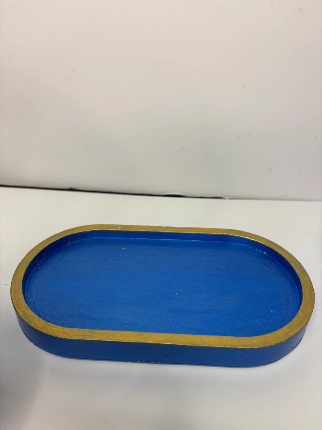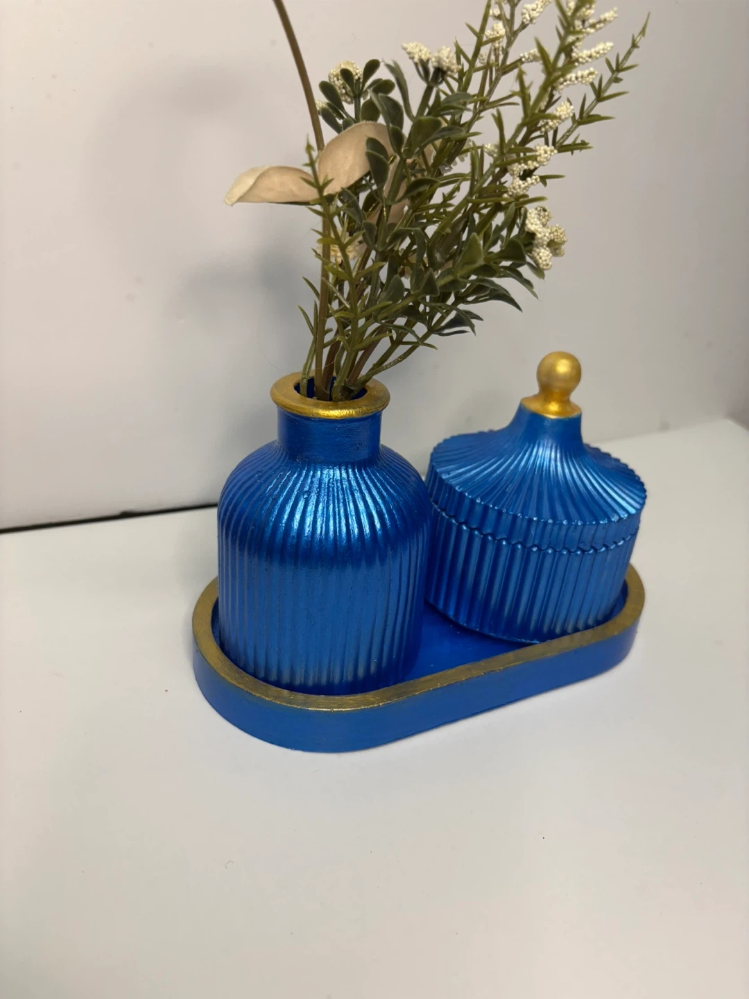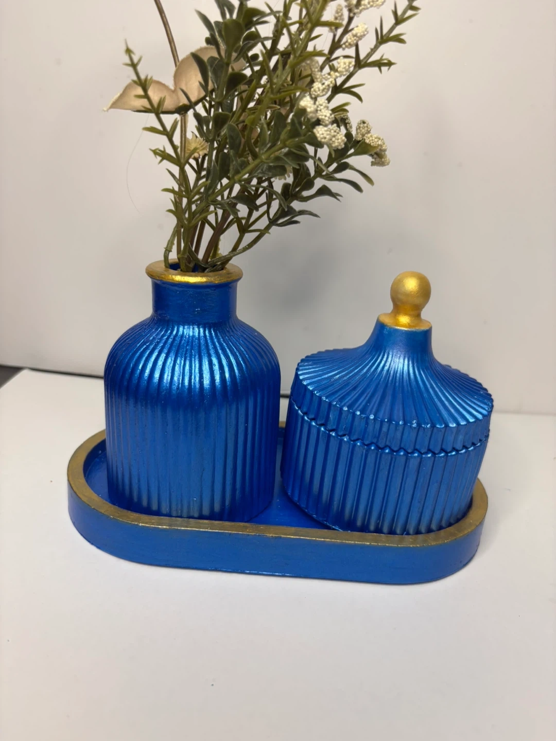 Elevate your space with this stunning, handcrafted Jesmonite decorative set. Featuring a striking metallic royal blue finish accented with subtle gold trim, this three-piece set brings a modern, luxurious touch to any room. This unique set is more than just a beautiful display piece—it's designed to be functional: * The Tray: An oval fluted tray perfectly cradles the two vessels, keeping your surfaces tidy and protected. Use it on your vanity, bedside table, desk, or bathroom counter. * The Bud Vase: A sleek, ribbed bud vase is perfect for holding dried flowers, a single fresh stem, or even pens and makeup brushes. * The Lidded Jar: The matching ribbed trinket jar has a removable lid, making it ideal for storing small items like jewelry, earrings, cotton swabs, hair ties, or spare change.