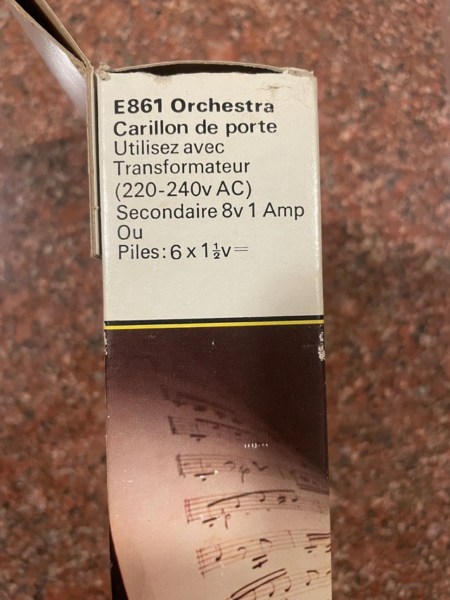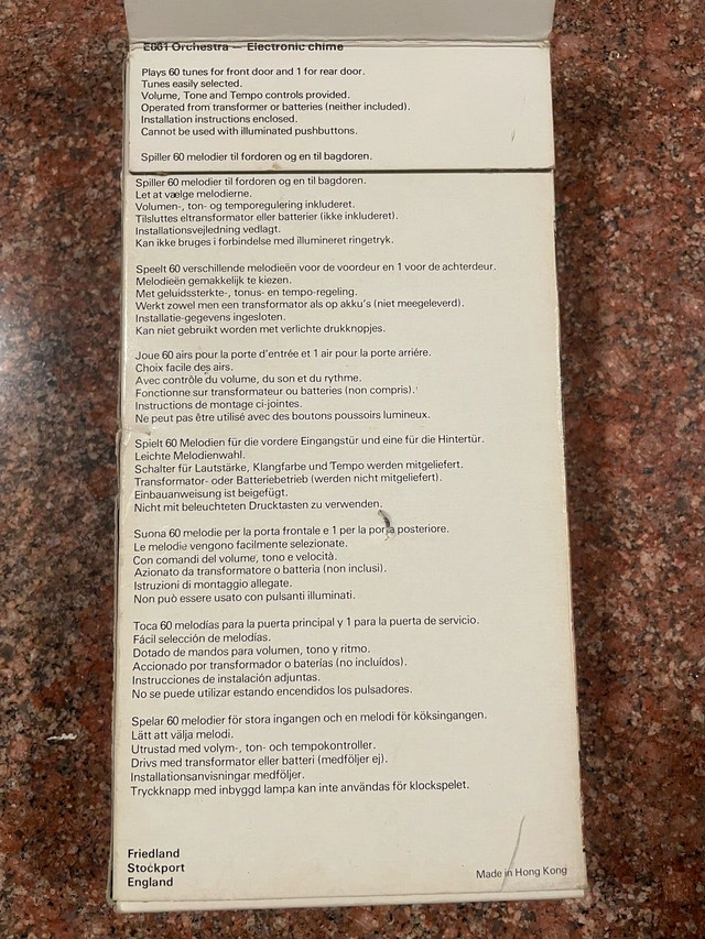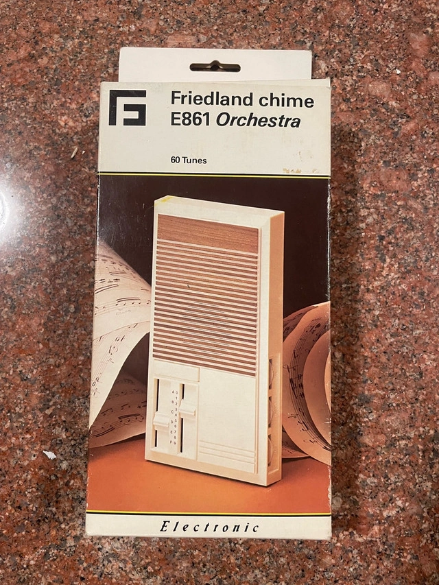 Rediscover vintage charm with this Friedland E861 Orchestra Electronic Chime, featuring 60 delightful tunes and volume/tempo controls. Operates with either a transformer (220-240v AC, 8V 1Amp) or 6 x 1.5V batteries (neither included). * Plays 60 tunes for front door and 1 for rear door * Volume and Tempo controls provided * Operated from transformer or batteries (neither included) * Installation instructions included * Can be used with illuminated pushbuttons