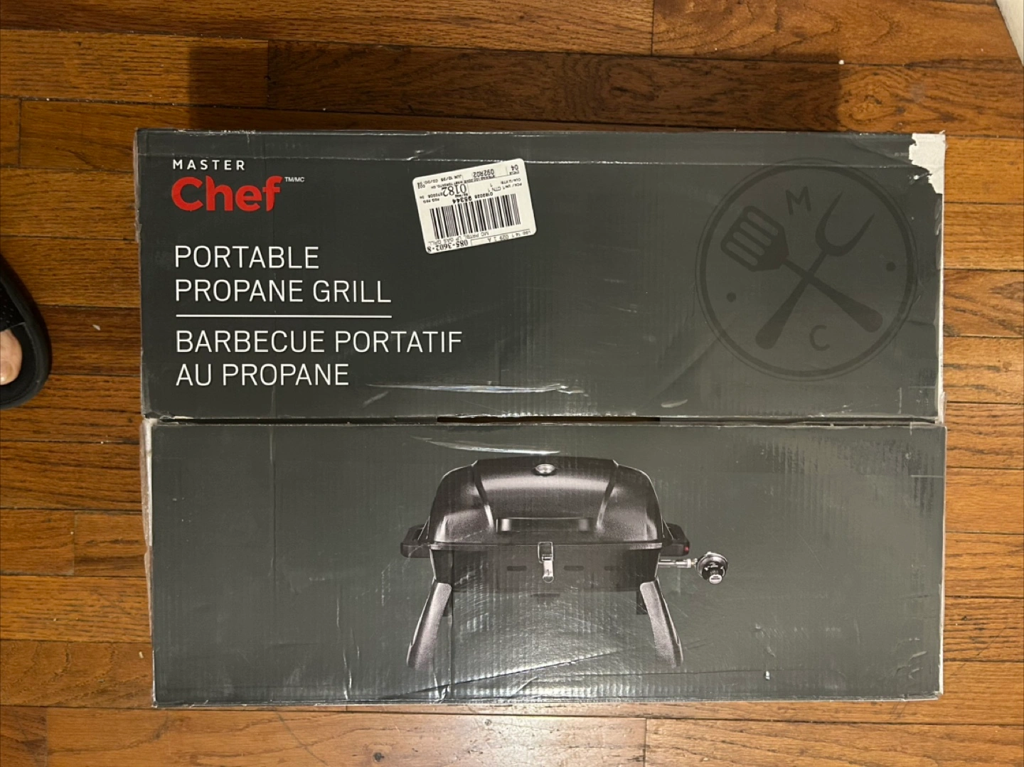 Selling a like new Master Chef portable propane grill! It has 10,000 BTUs and a 234 sq. in. cooking surface with a porcelain-coated steel grill grate. Perfect for small spaces and on-the-go grilling. Purchased for $79.( tax in) Only asking $45, cash please. Used 3 times camping. No room to store it over winter.