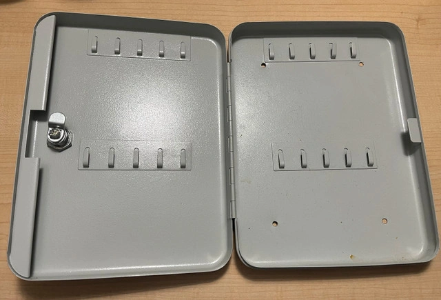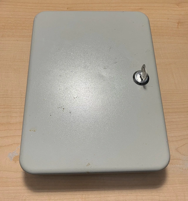 Keep your keys organized and secure with this wall-mounted key box, featuring a durable metal construction and a locking mechanism for added safety. It's perfect for home, office, or property management, ensuring your keys are always in their place. * Wall-mountable design * Locking mechanism with key This key box is in good shape, ready to keep your keys safe and sound. A secure little fortress for your precious keys!