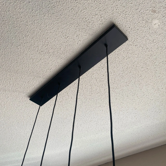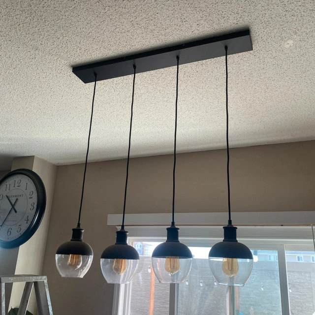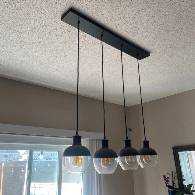 Add a touch of modern elegance to your dining area with this stylish black four-light pendant. The clear glass shades beautifully showcase the bulbs, providing a warm and inviting ambiance. This fixture is in good condition and ready to enhance your home's decor. Key features: - Sleek black finish - Four clear glass shades - Modern pendant design - Adjustable cable length In good working condition. No longer using and have been replaced. Pick up in Morningside SW Airdrie.