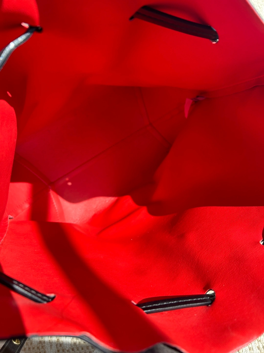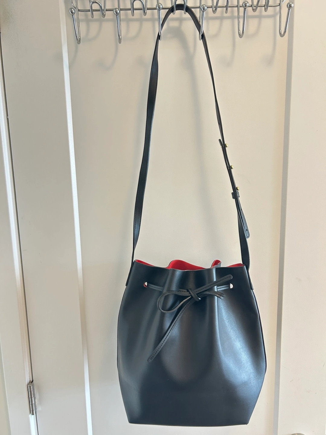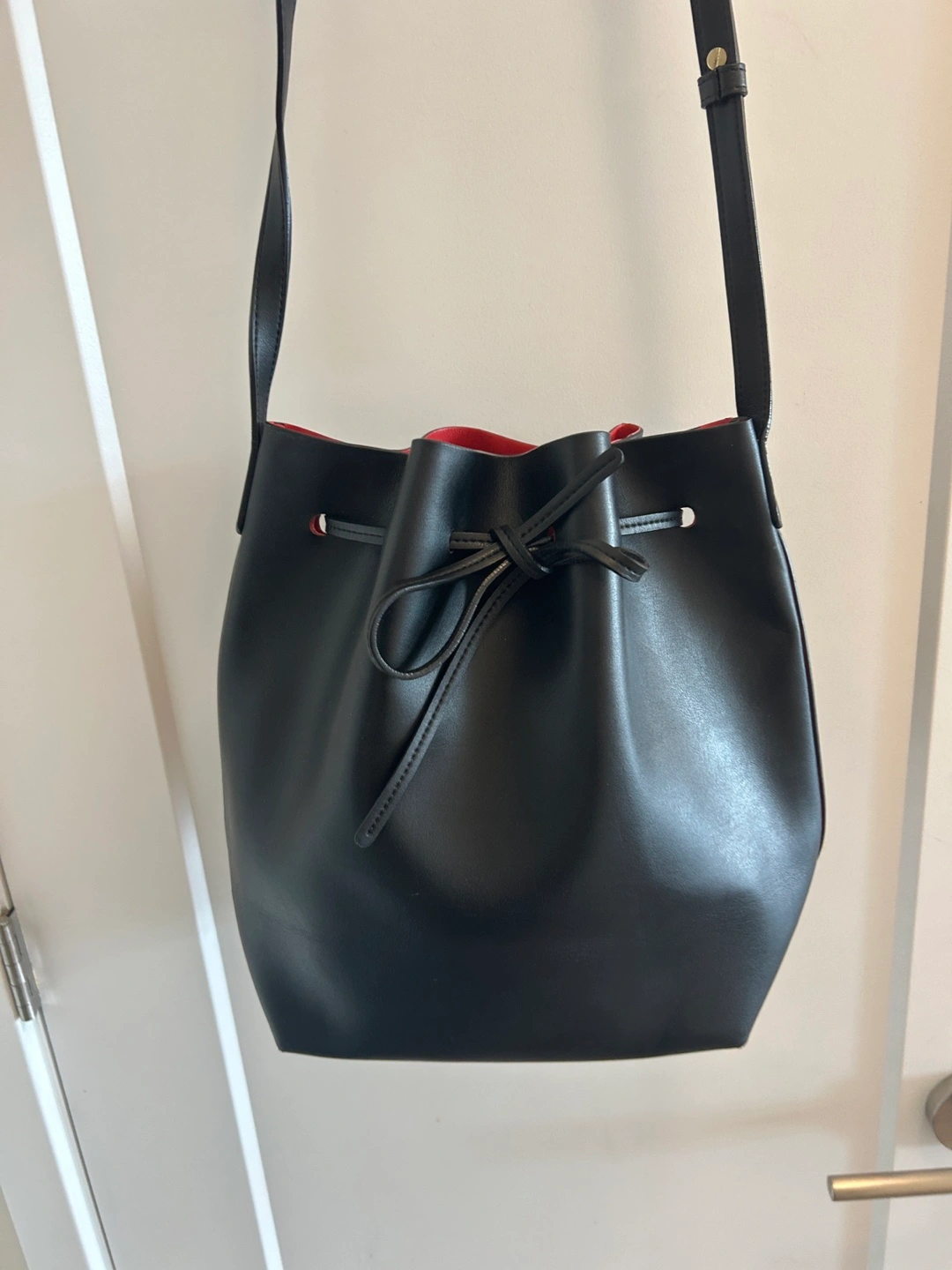 Selling a stylish Mansur Gavriel bucket bag, It's black leather with a vibrant red interior. This bag is in great condition and ready for a new home. it’s a gift, 1:1