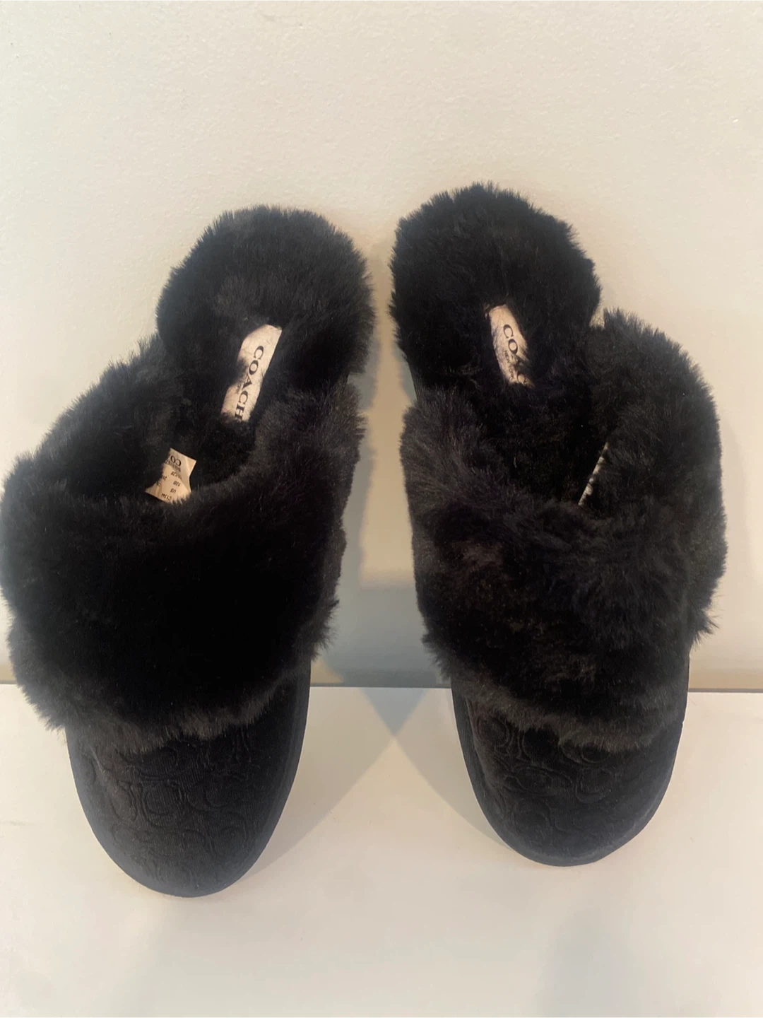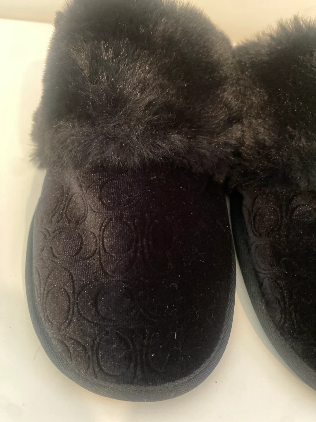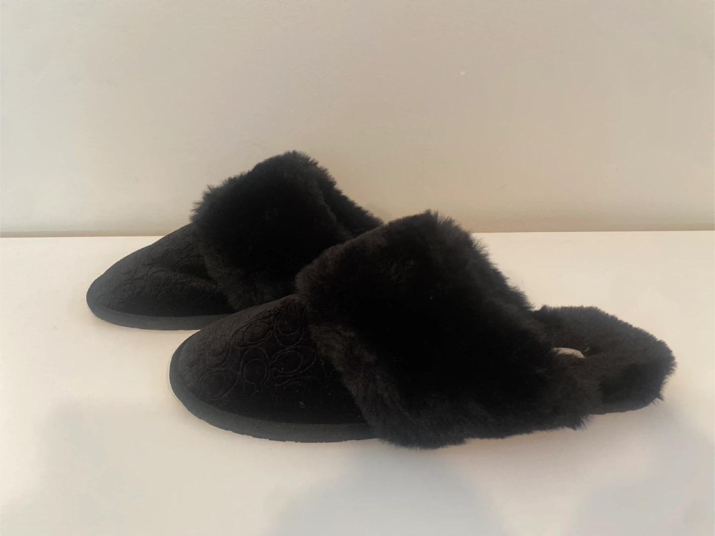 Cozy up with these Coach slippers! They're a women's size 10B in US sizing. These black slippers are super soft and perfect for wearing around the house. Pick up in Rocky Ridge.