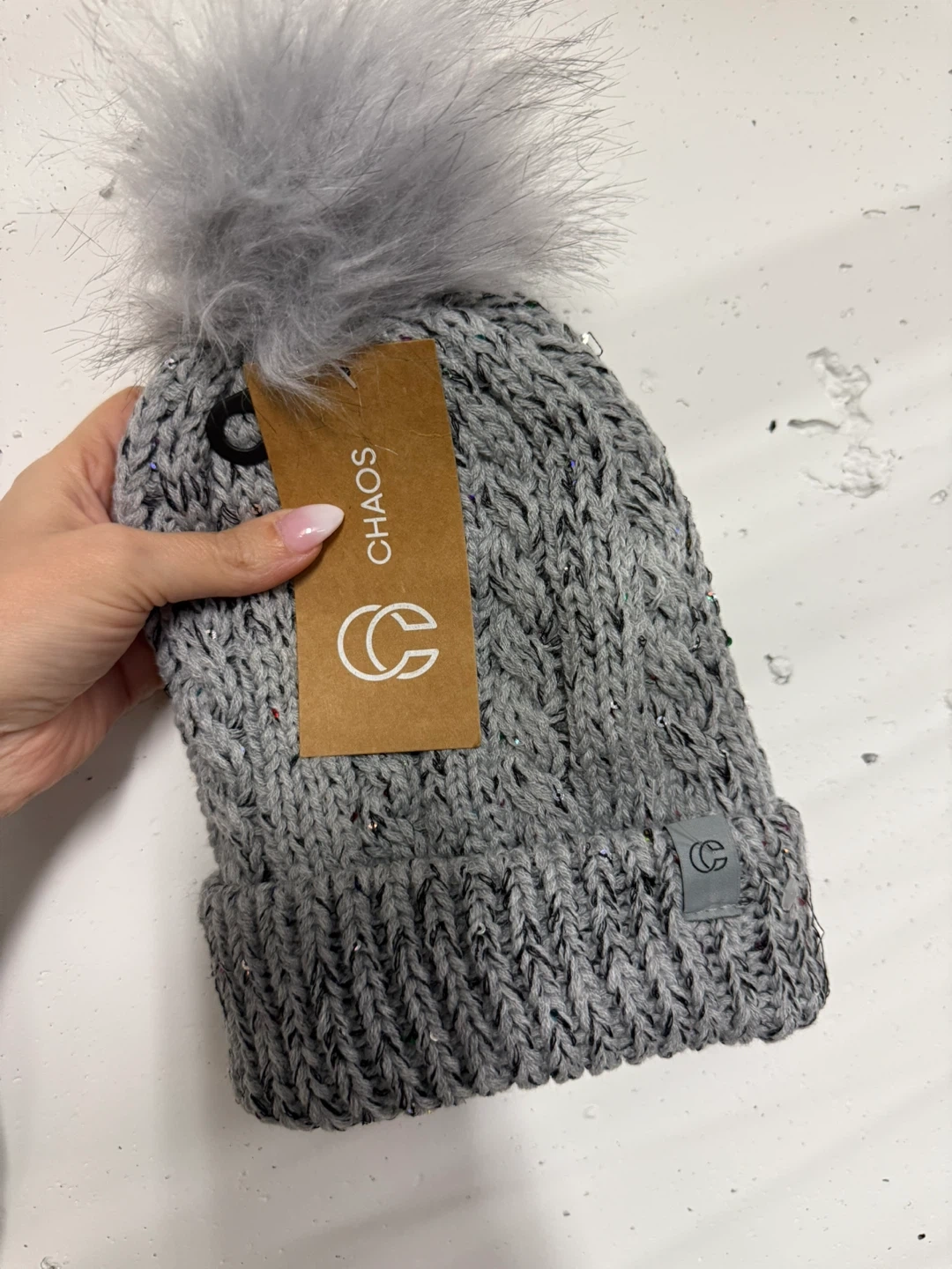 Cozy grey knit toque from Chaos, perfect for keeping warm this winter! Features a stylish pom pom on top. It’s in great condition and ready for a new owner