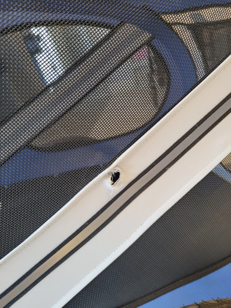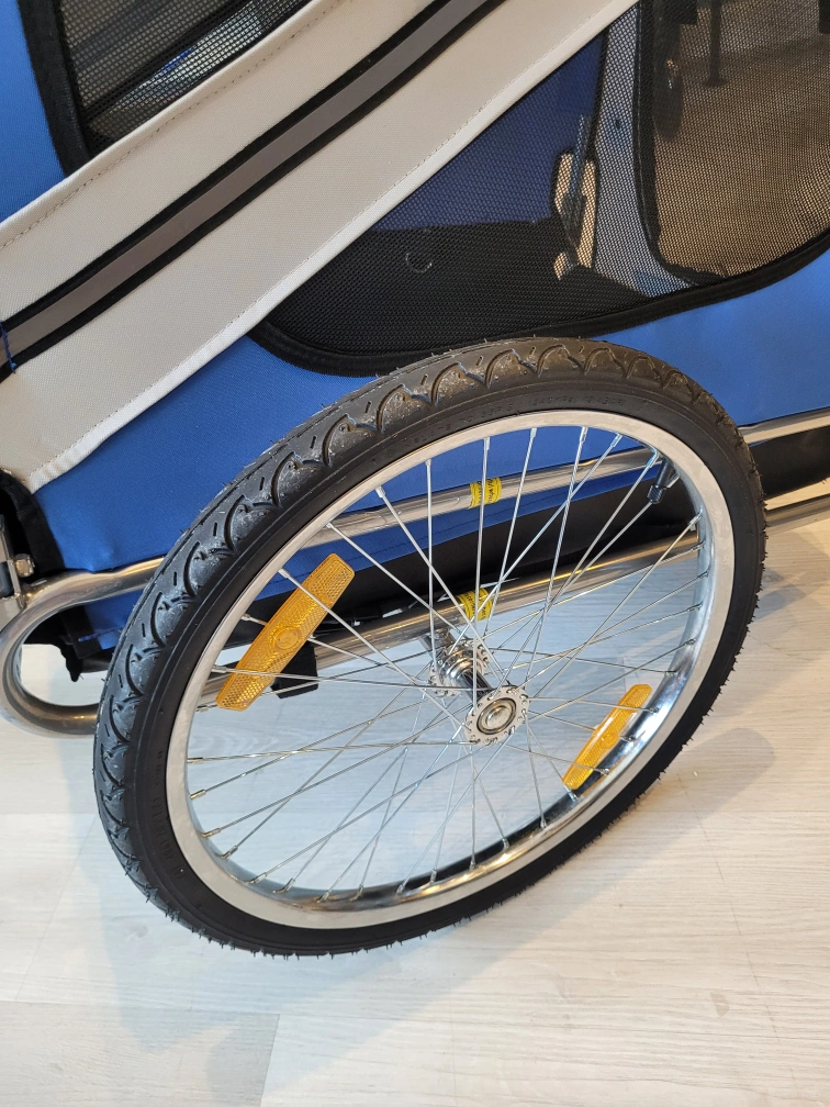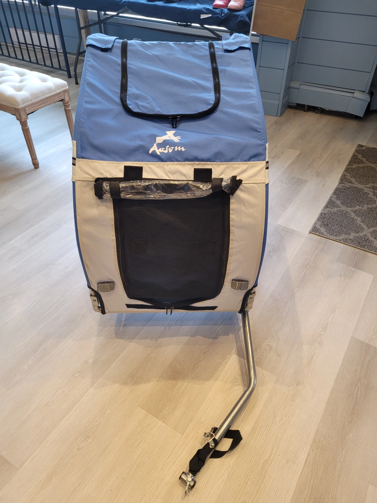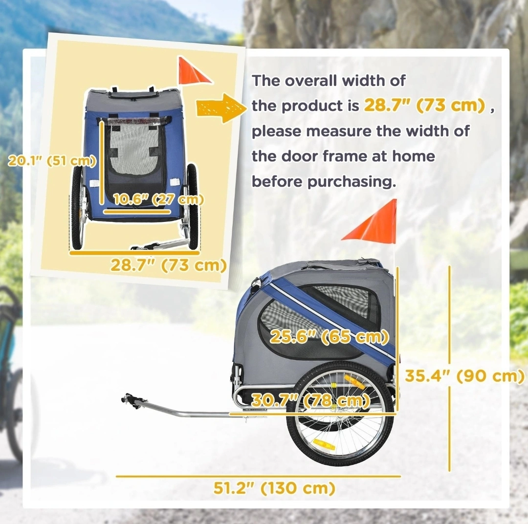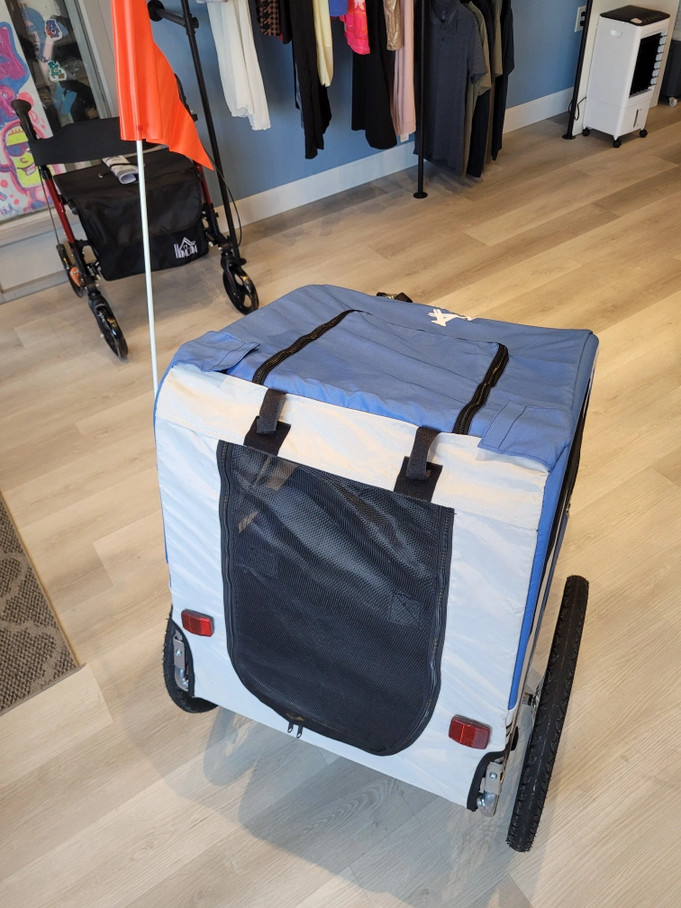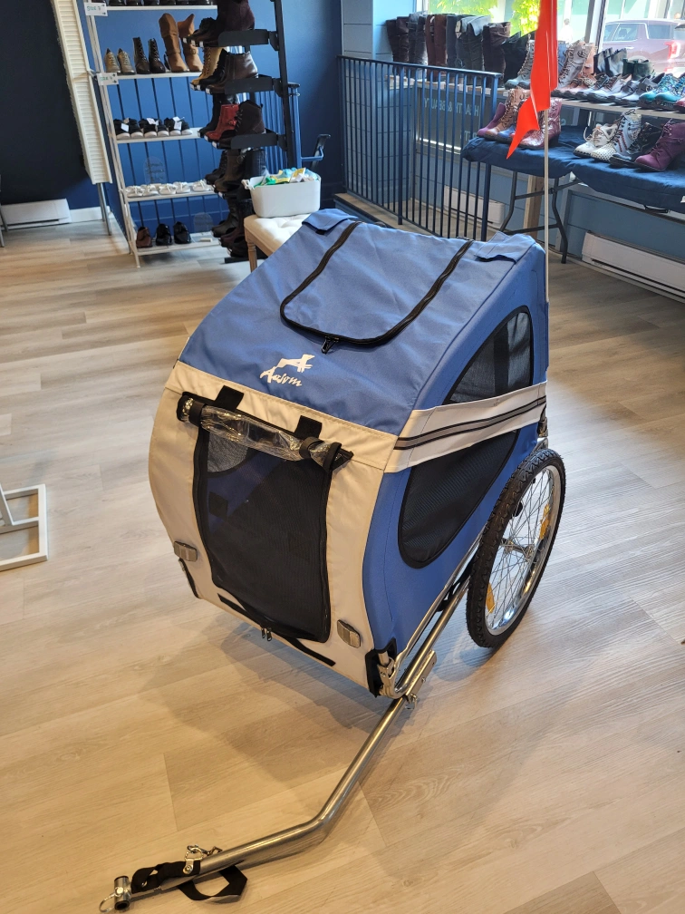 ***Minor Damage (2 small holes) on either side due to packing issue (see picture) *** Looking to sell a new dog bike trailer in blue and white! It's ready for your furry friend's next adventure. - Pet Trailer: Take your furry friend along for a bike ride with ease using this bicycle trailer. It's designed for medium dogs that are under 20.9" (53 cm) in length and weigh less than 44 lbs. (20 kg). - Hassle-Free Access and Luxurious Comfort: Your furry friends can quickly come and go through the enclosure's zippered front/back door. The mesh windows provide optimal ventilation and allow your pets to relish the scenic views. - Safety: Keep your furry friends safe and secure in the bike cart with the anchor point for a safety leash inside the dog wagon. Plus, with reflector stripes and a red flag, you can ensure increased visibility in traffic and low-light conditions. - Weather Protection: Oxford fabric builds on steel construction, equipped with weather shield. Water, and sunray resistant, provides shade to protect your pets from sun and rain. - Pet Bike Trailer Information: Overall Dimensions: 51.2" L x 28.7" W x 35.4" H (130 x 73 x 90 cm). Cabin Dimensions: 30.7" L x 21.7" W x 25.6" H (78 x 55 x 65 cm). Recommended Bike Wheel Size: 22"-28". * Pick up in store at 258 Main Street South, Newmarket (by appointment only to guarantee we are open). *** Payable by cash, debit or credit ***