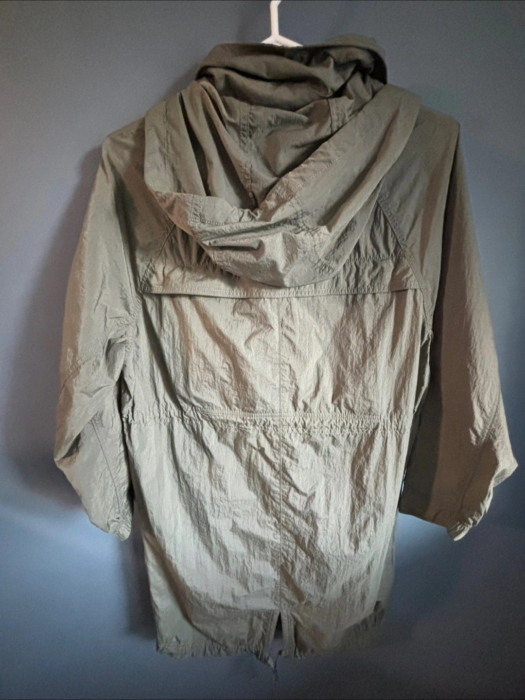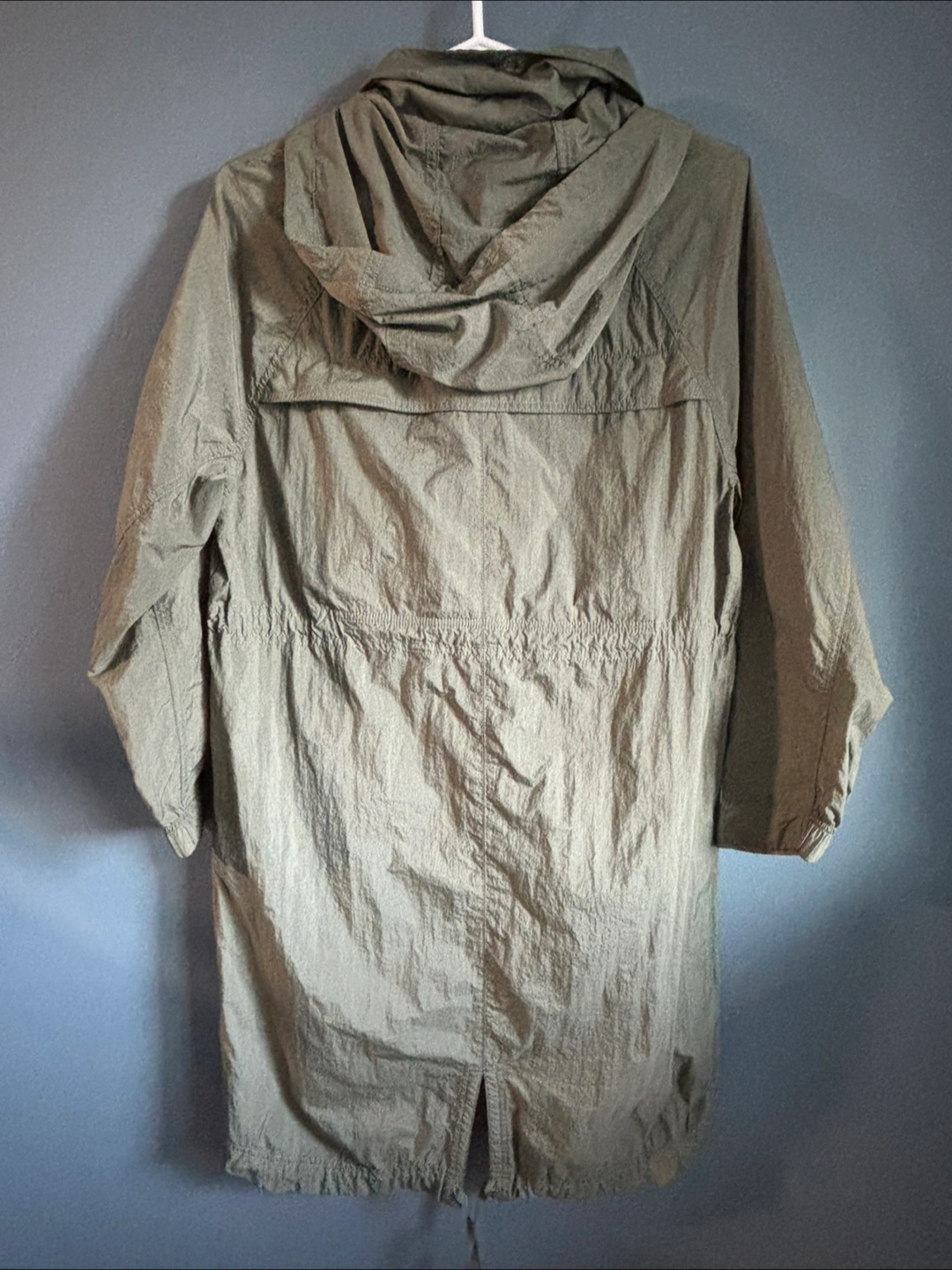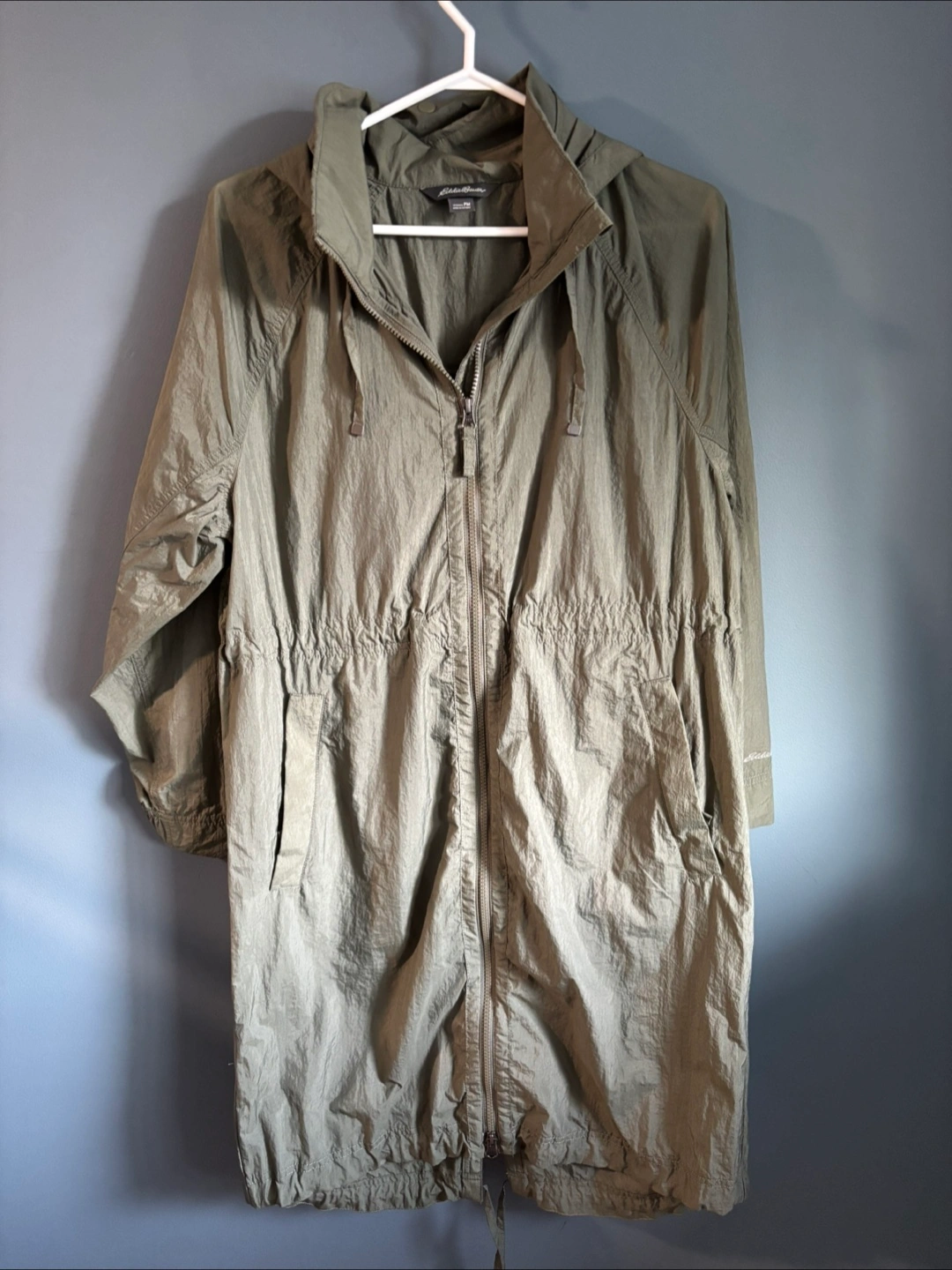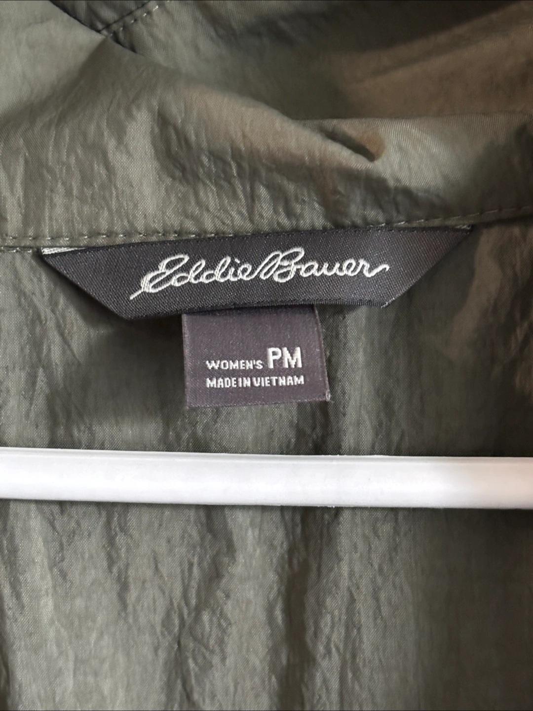 Here's an Eddie Bauer women's rain coat in size PM! It's a lovely olive green colour and is perfect for those rainy days