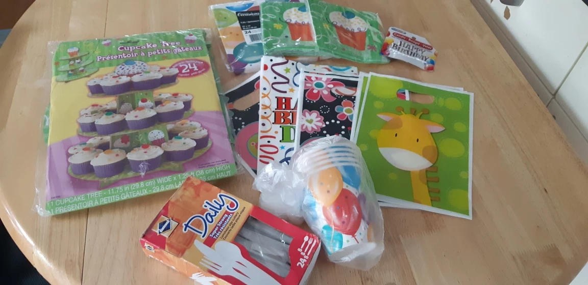 Selling a bundle of party supplies! Includes: - Diamond Daily Super Strong Luncheon Size Cutlery (24 pieces) - Occasions 2-ply Napkins (13" x 13", 33 cm x 33 cm, 24 pieces) + some 10"×10" - Celebration Happy Birthday Candle with Cake Decoration - Cupcake Tree Presentoir a petits gateaux (24 pieces) - used - Balloon themed paper cups - Assorted party favor bags