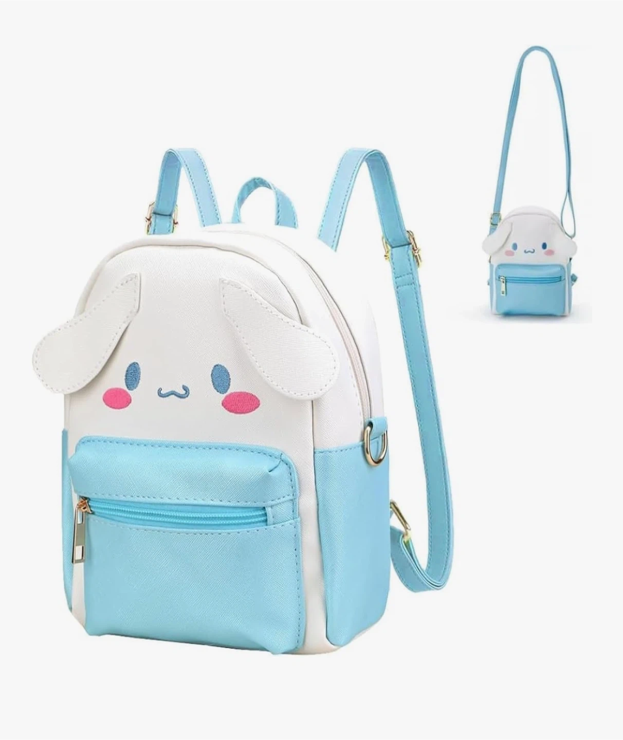 Super cute Cinnamoroll mini backpack! It's white and blue and features adorable Cinnamoroll details. - Cute patterns - Triangular reinforced hooks - Front pocket - Smooth zip Dimensions: - Height: 9 inches - Width: 7 inches - Depth: 3.9 inches