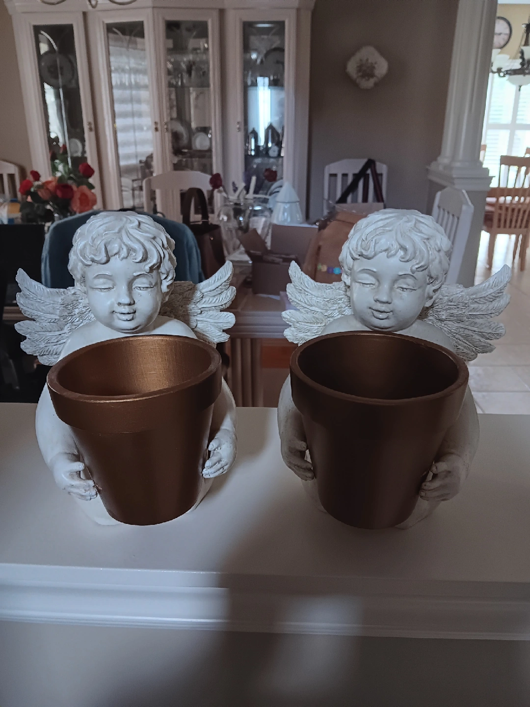 Here are two angel planters. They are white with a bronze coloured pot. They would look great in any home!