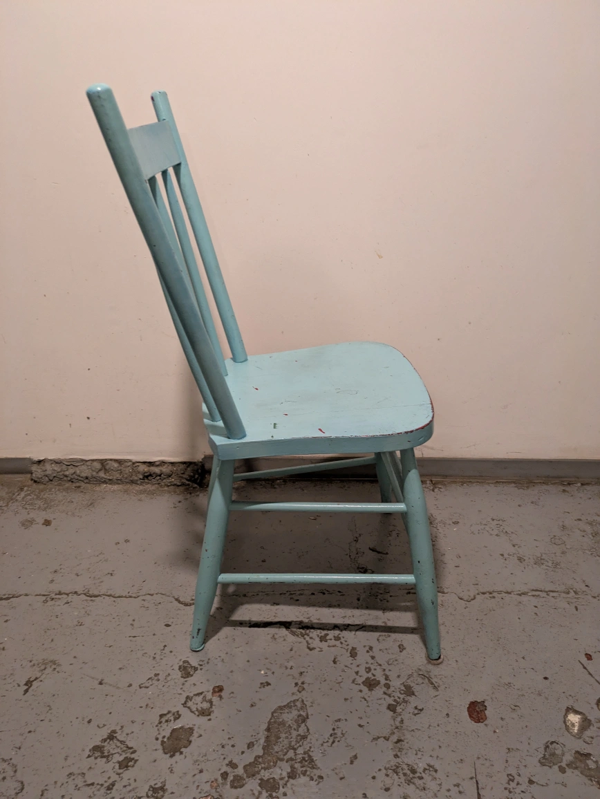 Selling a cute vintage wooden chair! It's painted in a lovely light blue colour. Perfect for adding a touch of retro charm to any room. There are some signs of wear, as you can see in the photos, but it's still sturdy and ready for a new home Pick up in the West End of Vancouver