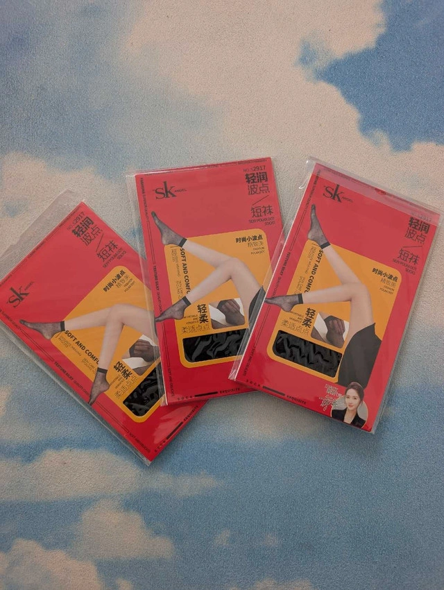 3 pairs of Brand New Black Polka Dot Silky Socks. These are soft and comfy with a silky texture. Light and see through with cute tiny poka dots. Great to pair with any shoes. 3 pairs for $10. Pick up North York Centre.
