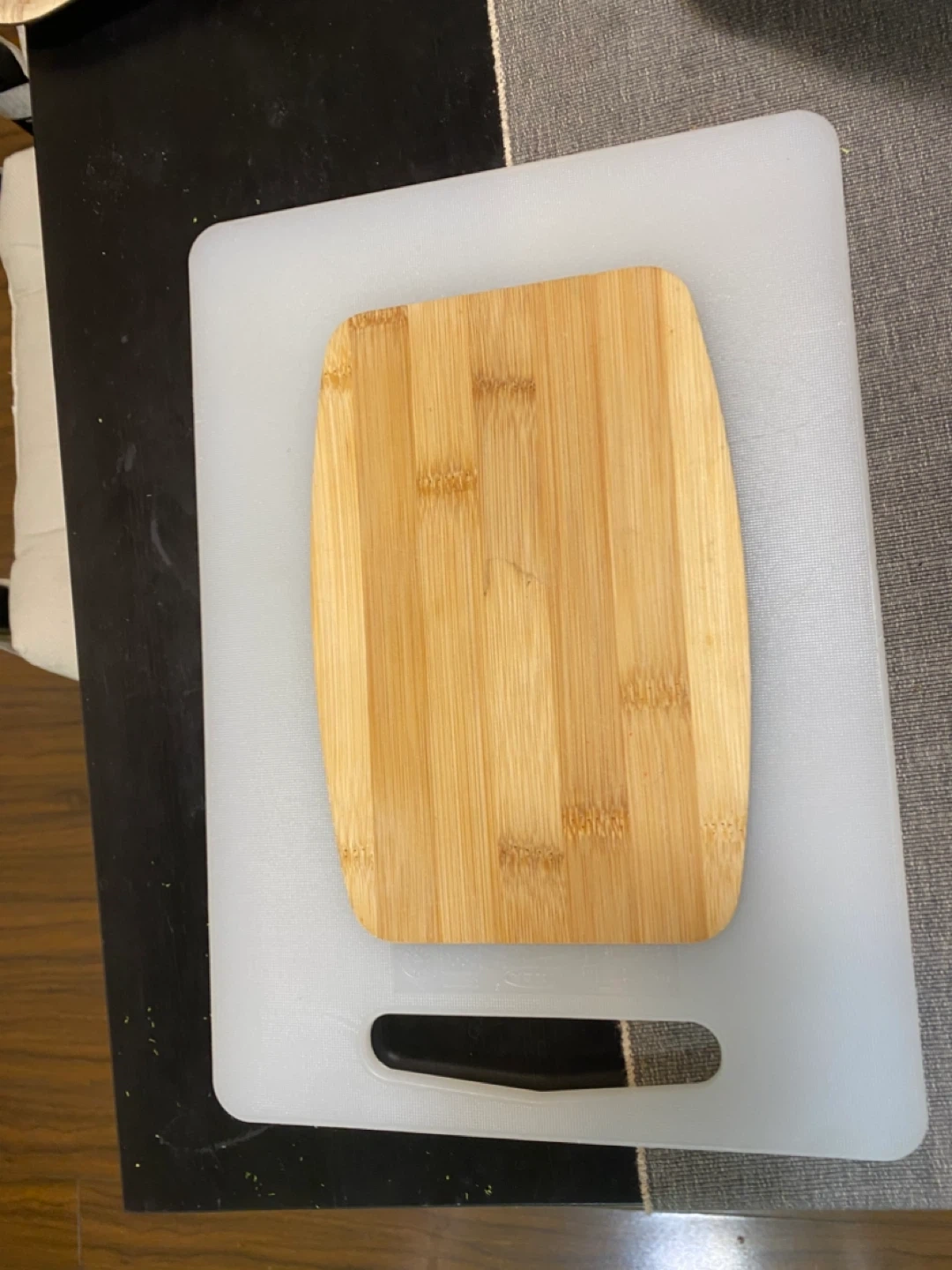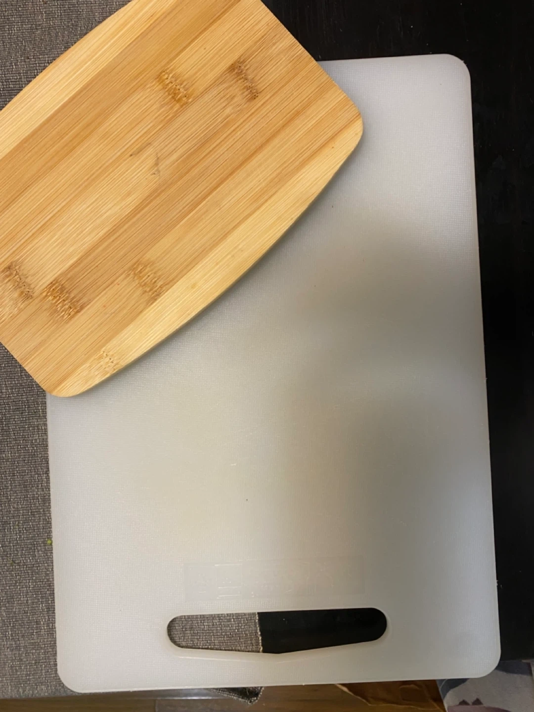 Selling a handy cutting board set! It includes one wooden cutting board and one plastic cutting board. Great for all your chopping needs in the kitchen