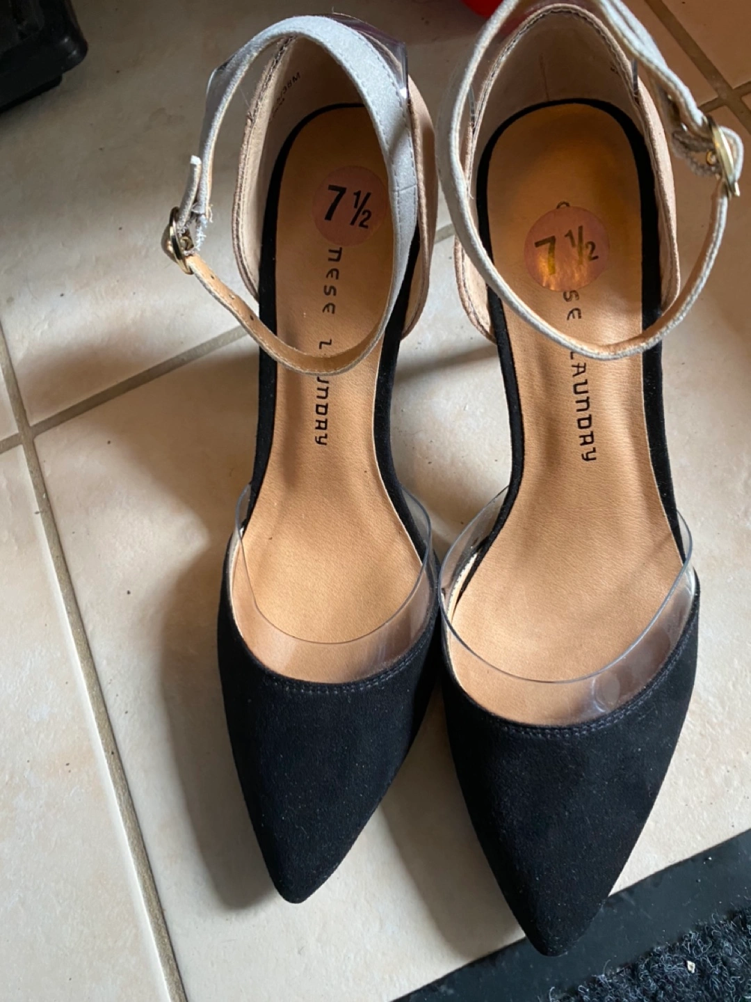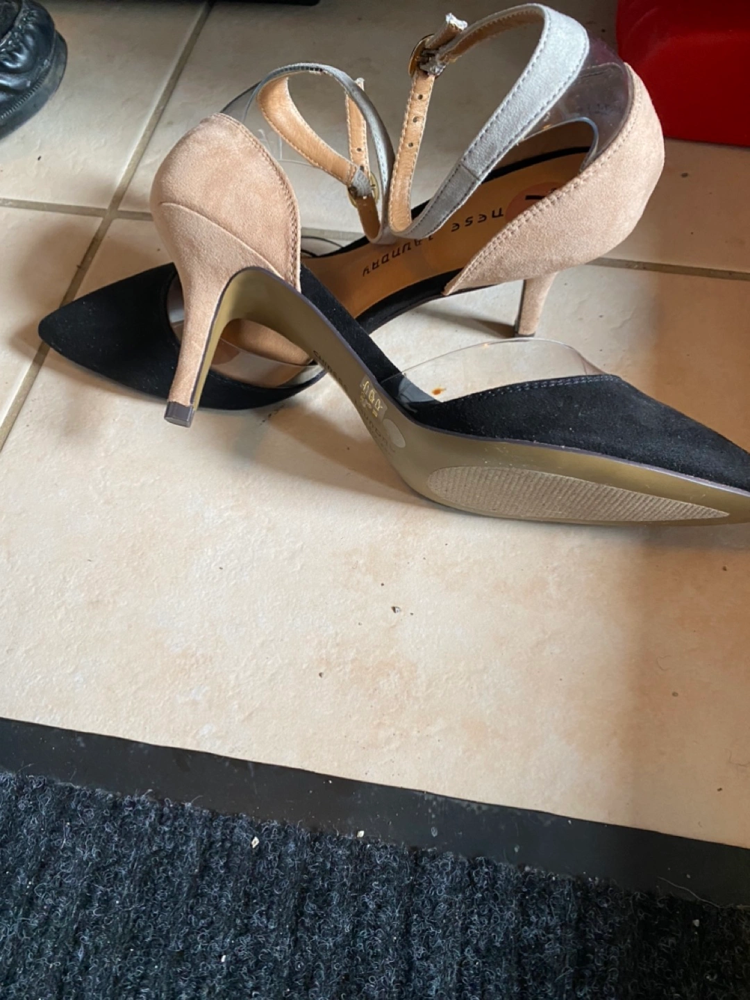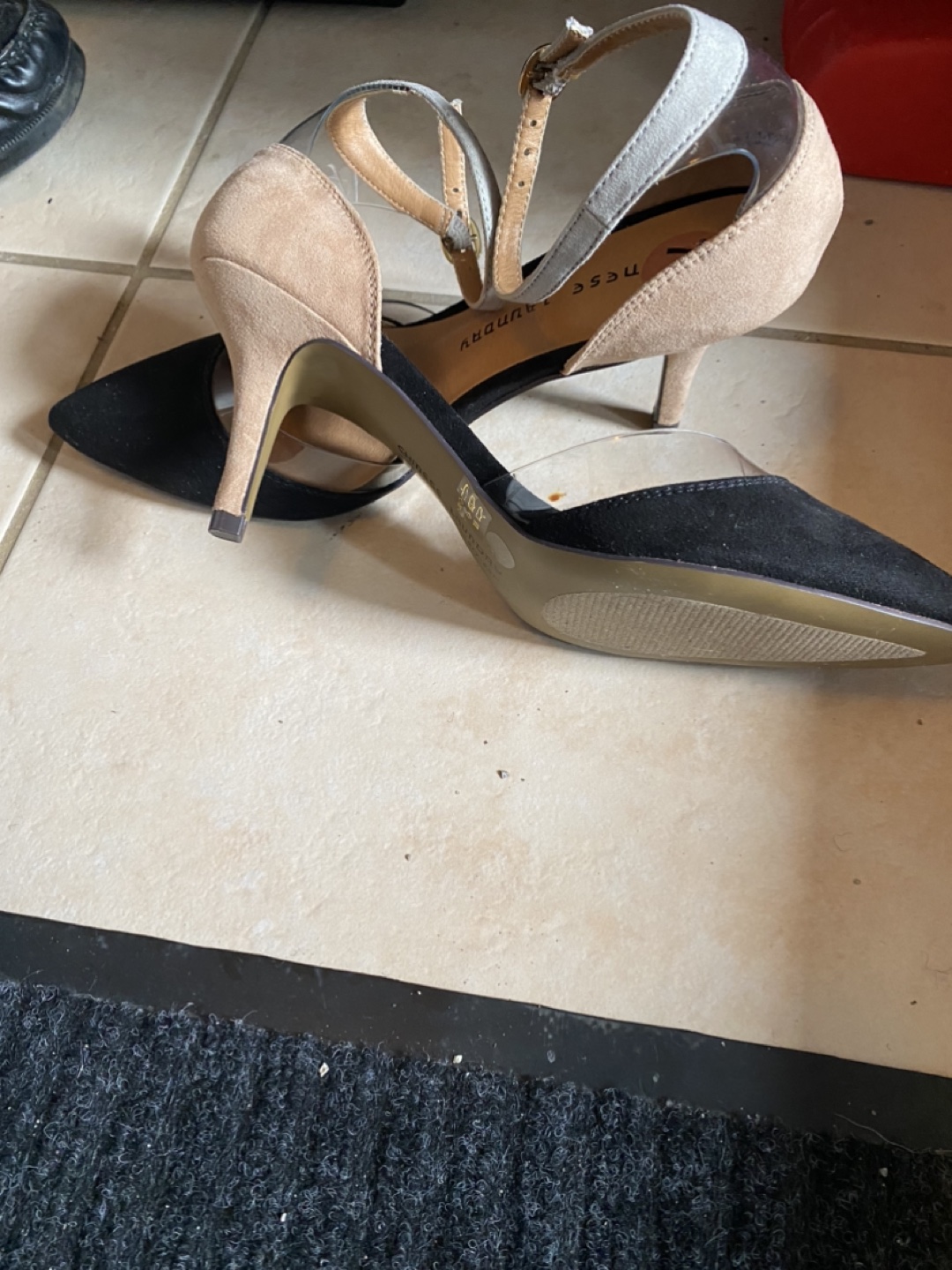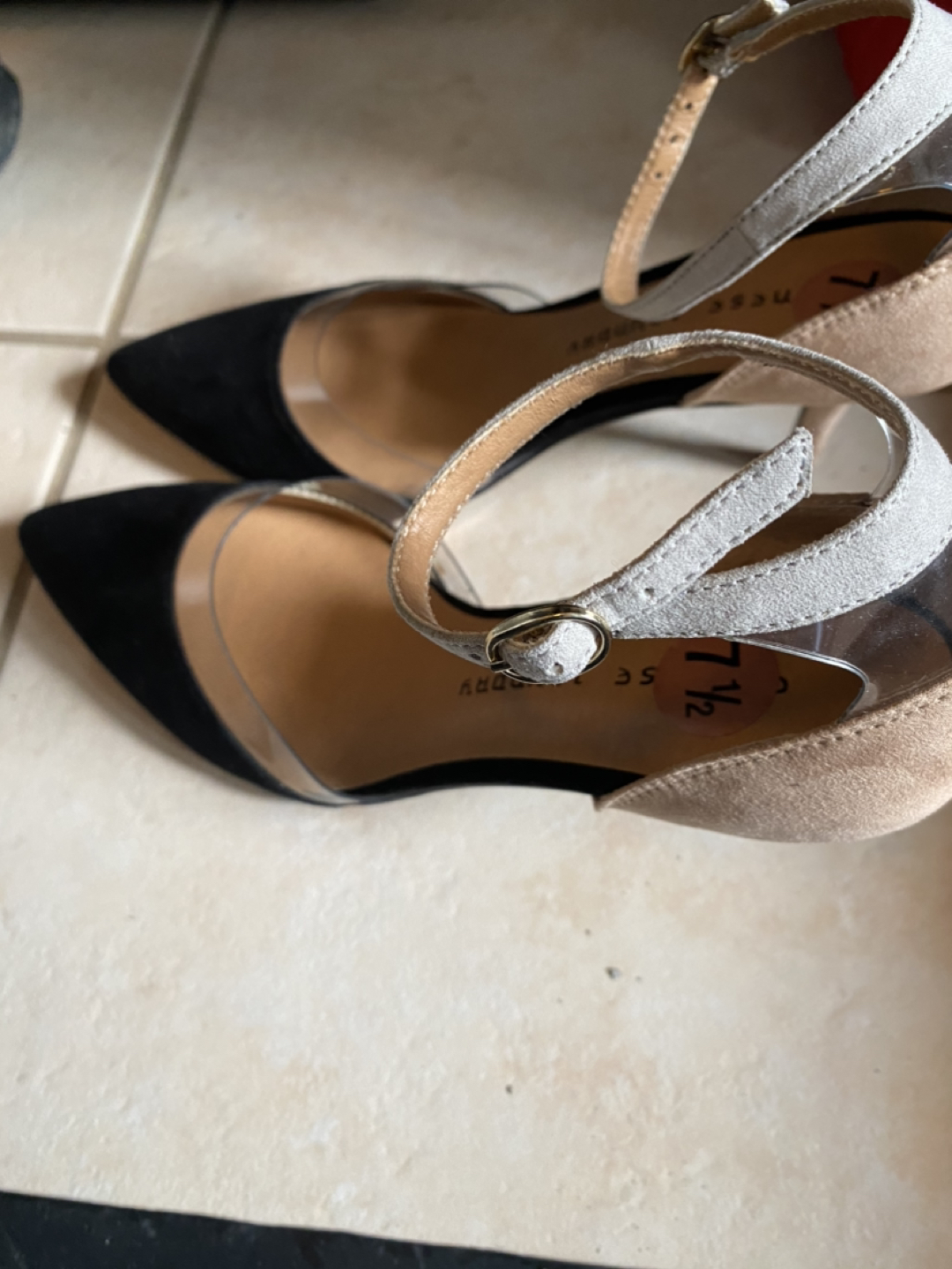 Never worn versatile heeled shoes. Perfect match for any colour outfit. Multiple strap holes to adjust tightness.