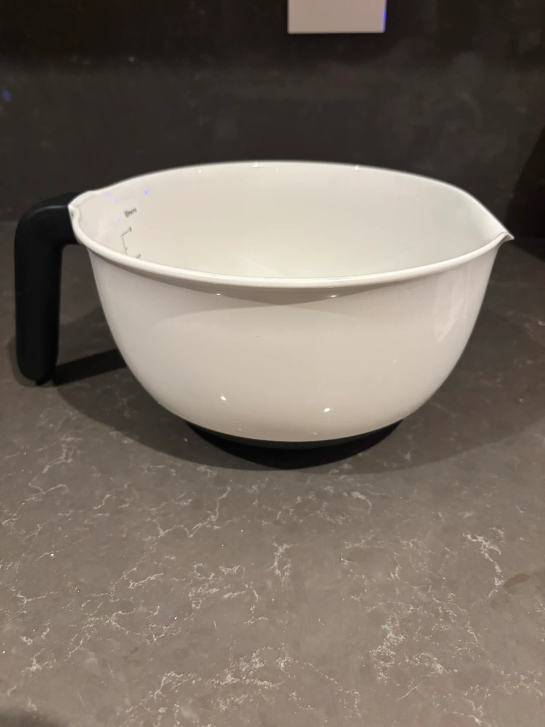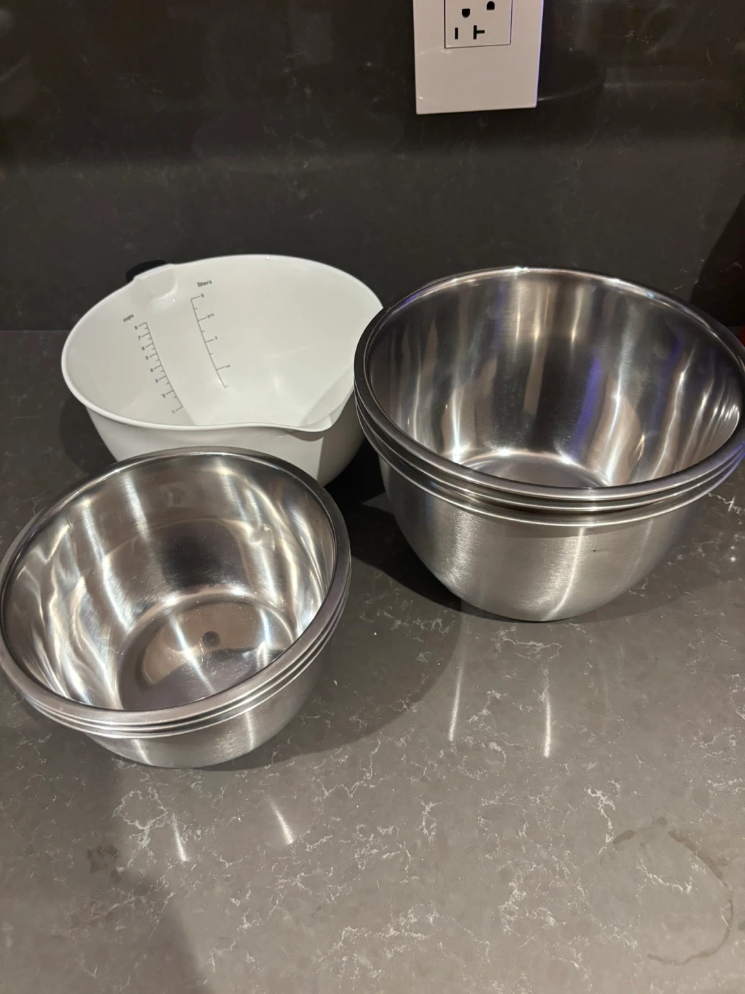 3 small and 3 medium stainless steel mixing/prep bowls. 1 x 2qt plastic mixing bowl with silicone handle and pouring spout. Pick up only, East York.