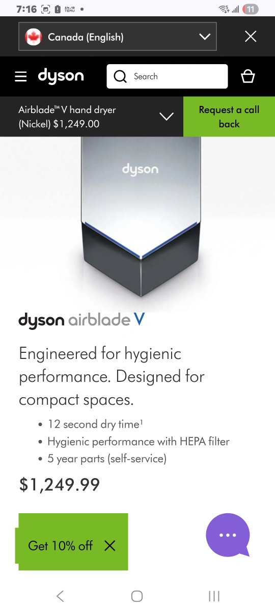 Selling a Dyson Airblade V hand dryer in nickel finish! It's engineered for hygienic performance and designed for compact spaces. Features include: - 12 second dry time - Hygienic performance with HEPA filter - 5 year parts (self-service)