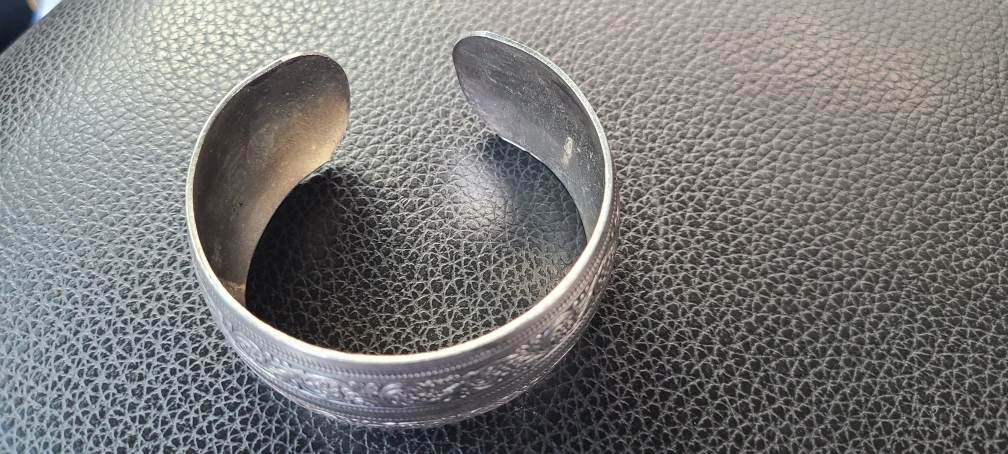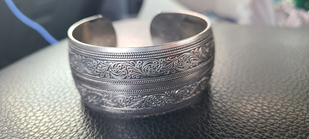 Selling a silver tone cuff bracelet. It has a unique design with detailed floral patterns around the band. It's in good condition!