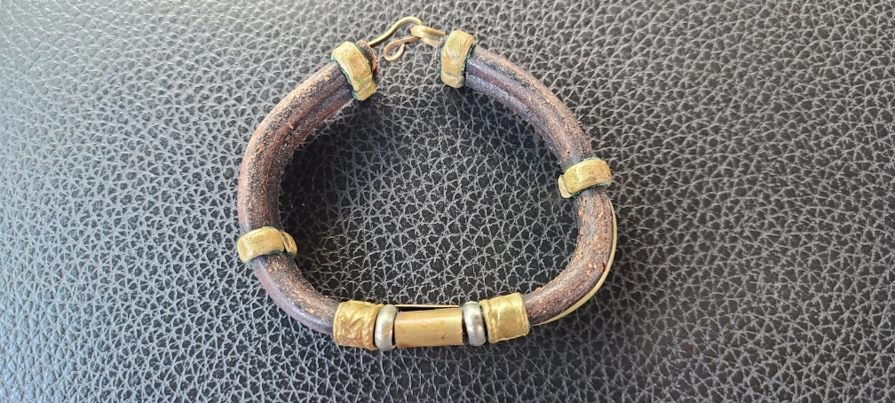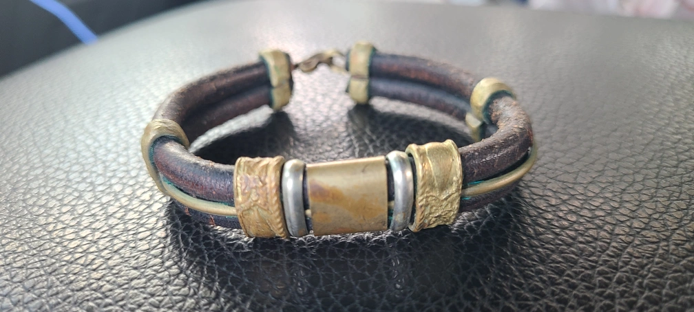 Selling a unique leather bracelet with metal accents! It has a rustic, earthy vibe with a mix of brown leather and brass-colored metal details. The bracelet has a clasp closure.