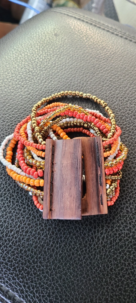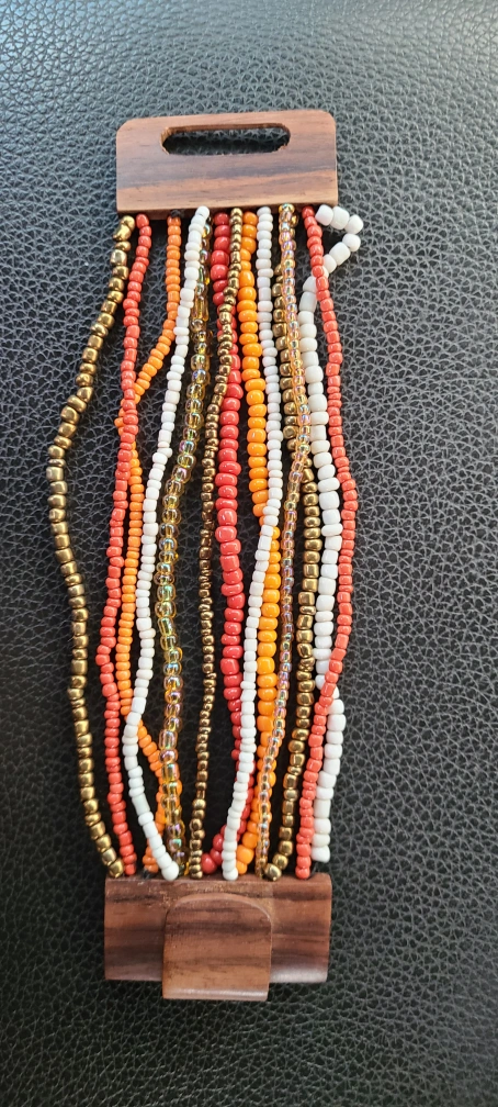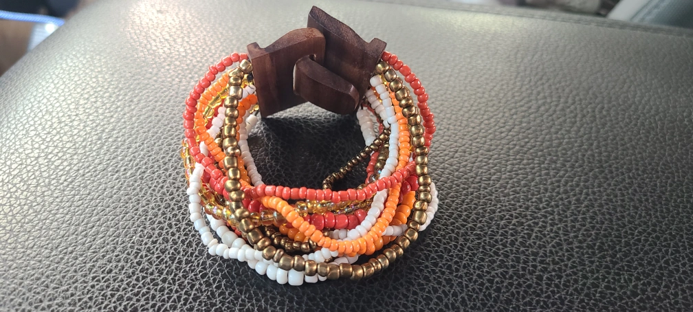 This is a beautiful beaded bracelet featuring strands of orange, white, and gold beads. It has a unique wooden clasp. Perfect for adding a pop of color to any outfit!