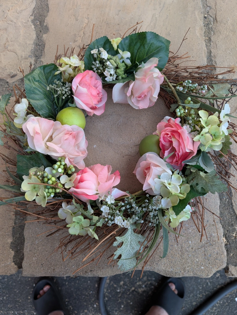 Selling a beautiful floral wreath! It features pink and white flowers with greenery on a twig base. Perfect for adding a touch of spring to your home